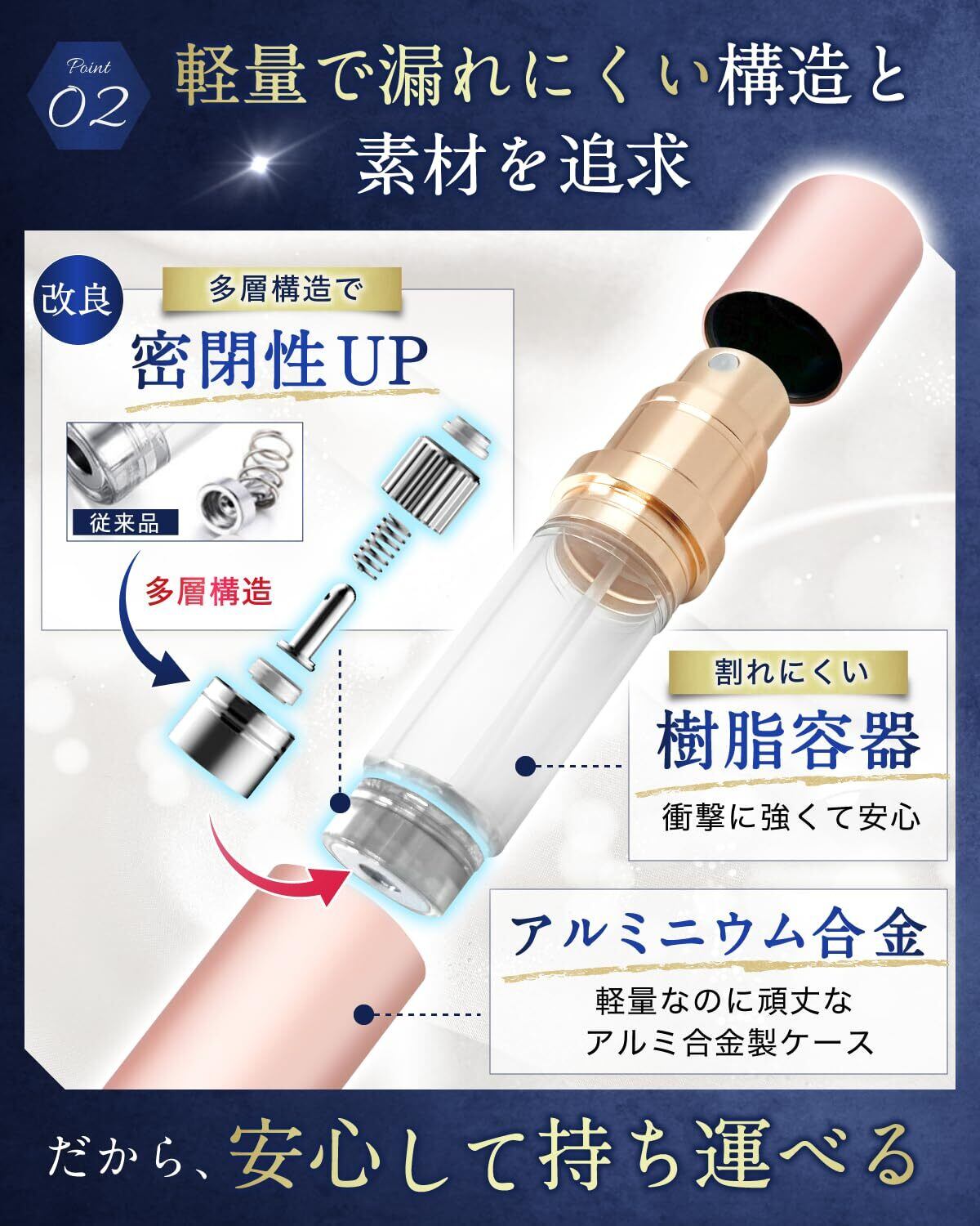 【漏れにくさと耐久性を追求】MELISY Perfume Atomizer は、香水が漏れにくいアトマイザーとして設計されました。香水を収納する内側容器と外側ケースの二重構造で、漏れる心配が少なく、香水の収納に最適です。キャップ部分は高い密閉性を誇り、香水を吸引するバルブも金属製の多重構造により漏れにくい設計になっています。また、内側容器は樹脂製で、ガラスよりも割れにくいです