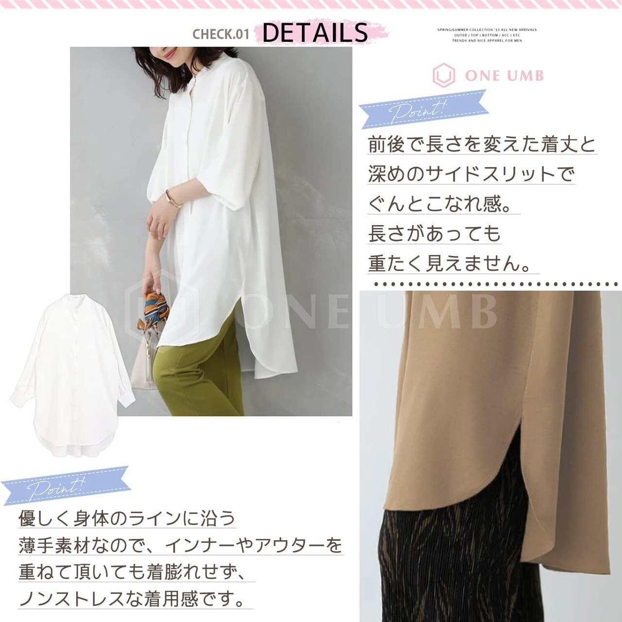 前後で長さを変えた着丈と深めのサイドスリットでぐんとこなれ感。 軽やかで動きやすいサイドスリット入りでシャツワンピースでも重たく見えません。 シャツの袖口を捲ったり、細めのベルトでウエストマークしたりする事でいっきにイマドキコーデに◎ ベストやビスチェと合わせたレイヤードスタイルもオススメです。