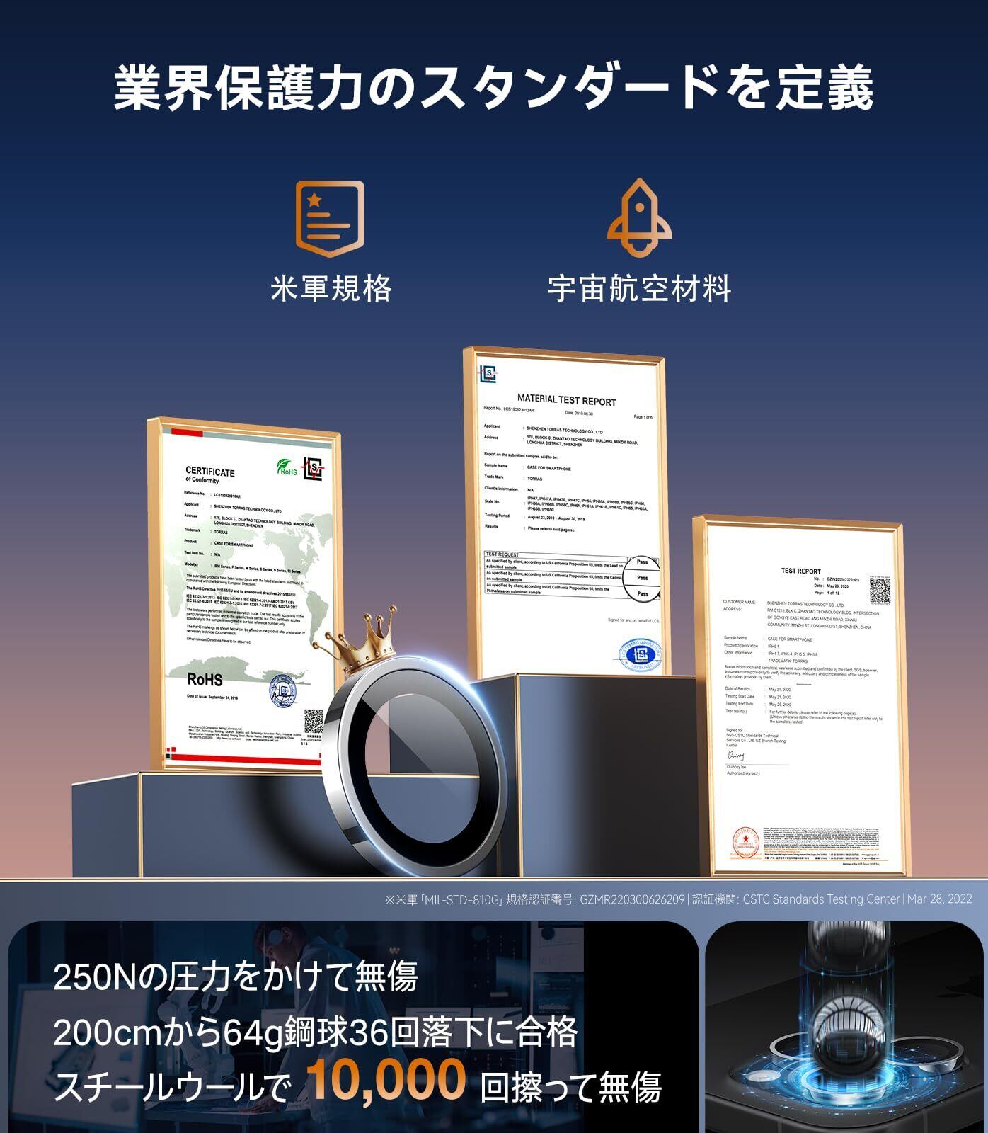 【共に過ごす瞬間を傷なく残そう!】少しのキズでも、撮影を邪魔し、愛する家族・趣味の写真などの撮影も、心から楽しんでできなくなってしまう。しかも、だんだん大きくなったiPhone15 プロ・15 プロ マックスは、日常生活の鍵などに弱い。iPhone 15 Pro・15 Pro Max 用カメラフィルムは、超硬度ナノセラミックスをガラスフィルムに溶け込ませて、表面硬度が9Hを超え、「MIL-STD-810G」米軍軍用規格テストに合格した。日常生活で、どのように擦れても、カメラは新しいままに!キズないカメラこそ、共に過ごす瞬間を完璧に写真に残せる!※米軍「MIL-STD-810G」規格認証番号:GZMR220300626209|認証機関:CSTC Standards Testing Center|Mar 28, 2022