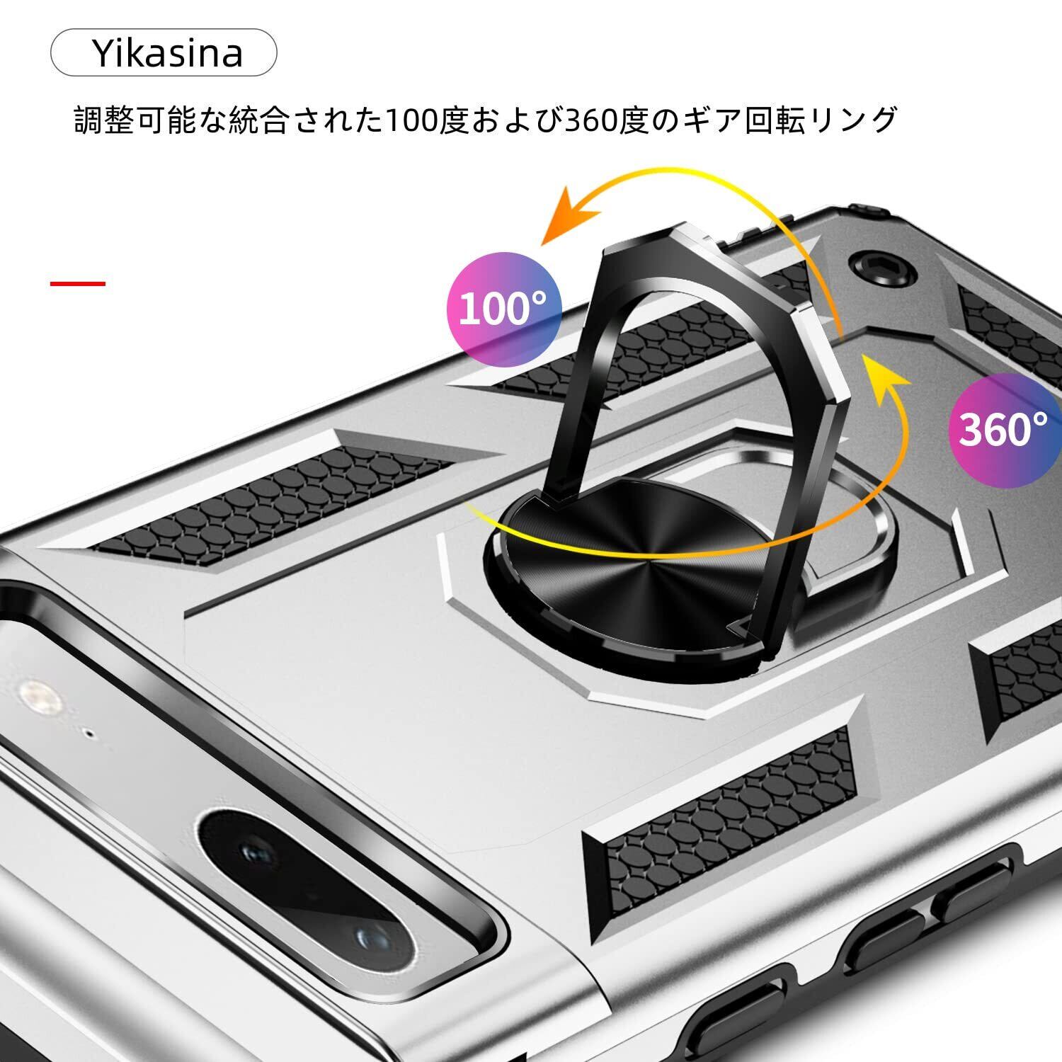 【Yikasina】 Google Pixel 7a ケース リング 米軍MIL規格取得 薄型 軽量 車載ホルダー対応 ピクセル7a ケース 360度回転 スタンド機能TPU+PC指紋防止 取り出し易い (Pixel 7a, シルバー)