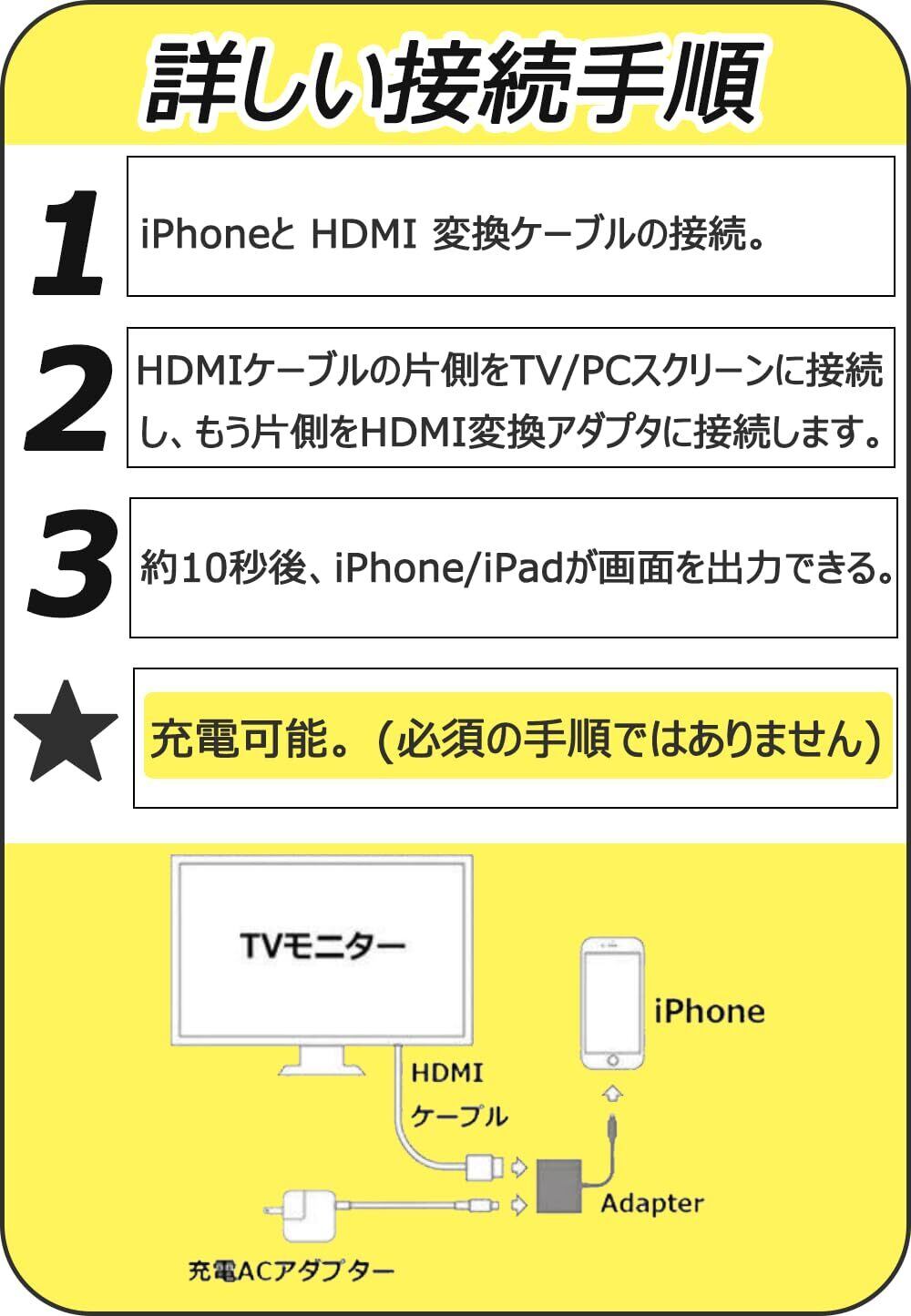 【品質】当店でご購入の製品は24ヶ月間のサービスをご提供しております。お客様にご不明な点がございましたら、お気軽にお問い合わせください。お問い合わせ方法:アカウントサ一ビス → 注文履歴 →ご注文 →「出品者」→「出品者に連絡」。【パッケージ内 容: iPhone hdmi変換ケーブル*1個、写真と文字による日本語取扱説明書*1個、書*1個。】