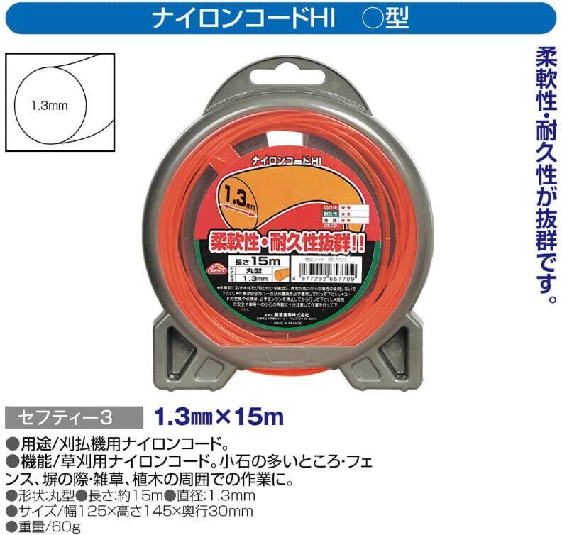 【在庫セール】セフティー3(Safety-3) 草刈・刈払機用 柔軟性・耐久性抜群 ナイロンコードHI 15m 丸型 1.3mm径