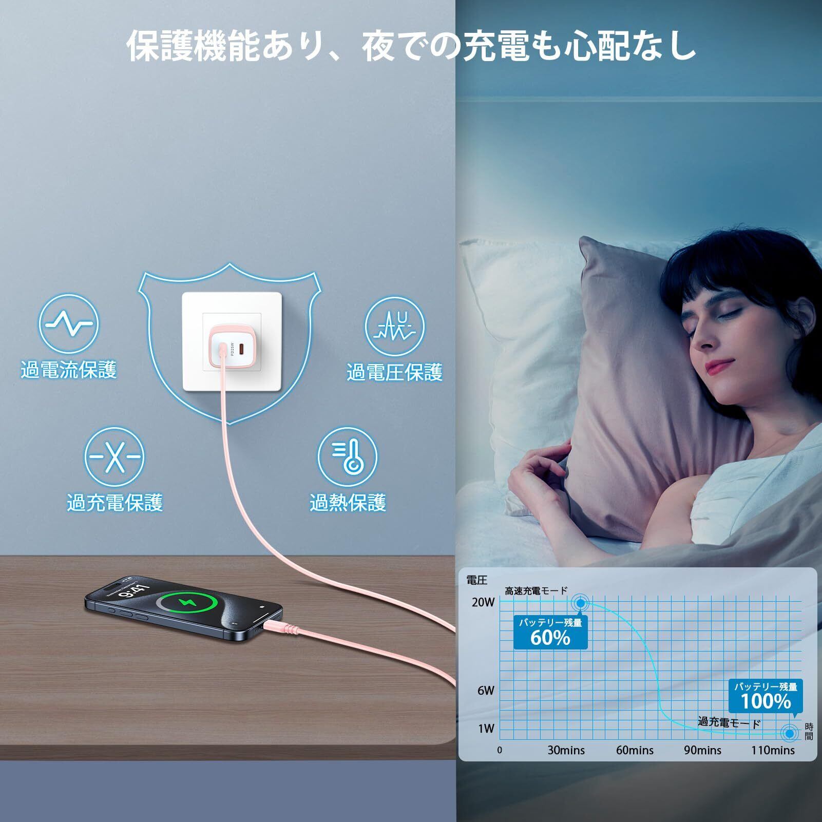 【マルチ保護システム・こだわりのある安全設計】PSE認証を取得し、当社独自の多重保護システムにより過充電、過放電、過熱、短絡を避けて充電器自体とデバイスを保護でき、充電をもっと安全になります。また、スマートICを搭載され、最大25W-5V/3A、9V/2.77A;PPS規格対応: 3.3-5.9V=3A,3.3-11V=2.25Aに対応し、自動判別機能を通して、接続されたデバイスに最適な出力でかしこく充電できます。