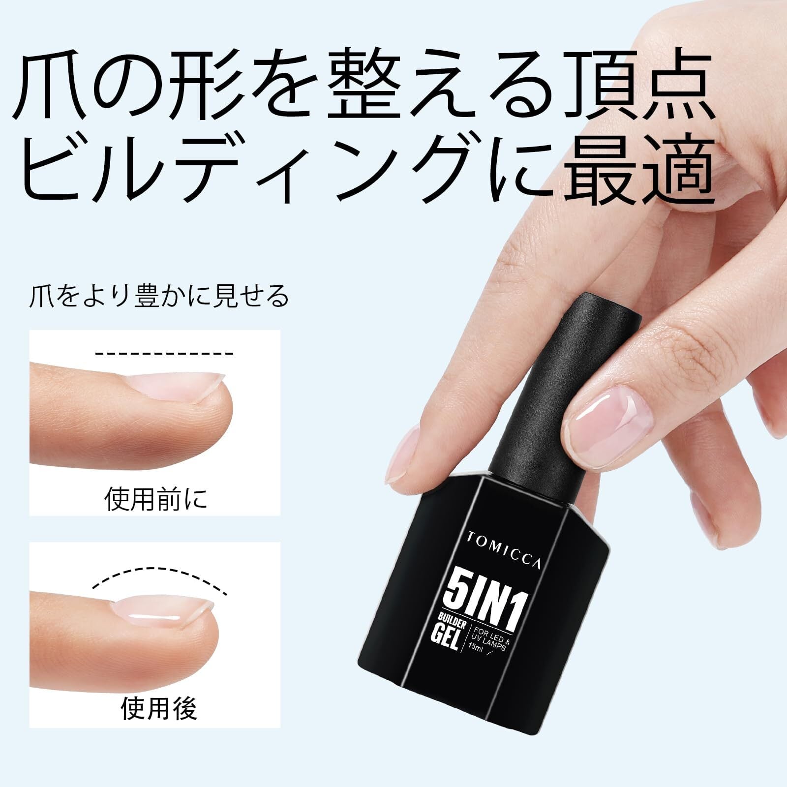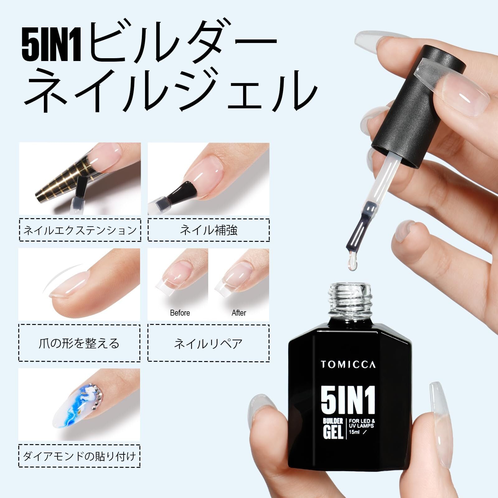 5 In 1ネイルジェル:TOMICCA 5 in 1ビルダージェルは、長持ちするプロフェッショナルな結果をするために専門的に配合されています。この多目的製品を使用すると、爪の形を整えたり、最大1cmまで伸ばしたり、デカールやジュエリーを貼ったり、保護ベースコートや長持ちするシーラントを塗ったりすることができます。