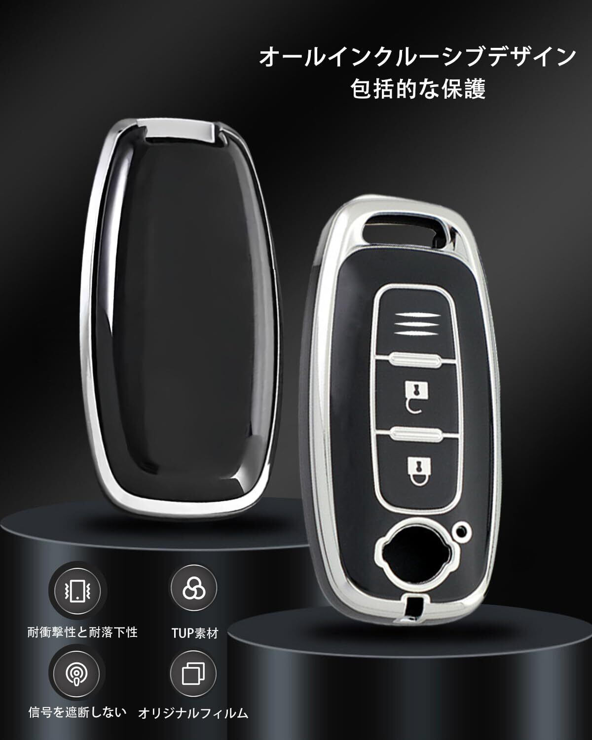 【在庫セール】[RUNFANGYUAN] 適合 スマートキーカバー 日産 キーケース TPU 軽量 2ボタン キーカバー 対応 日産車用 新型エクストレイル スマートキーカバー サクラ アリア 等に適用 傷防止 耐衝撃 車キーケース キーホルダー(ブラックシルバー)
