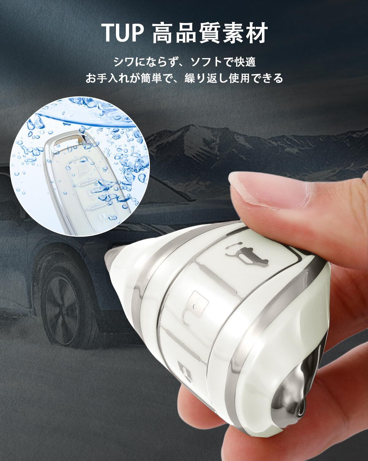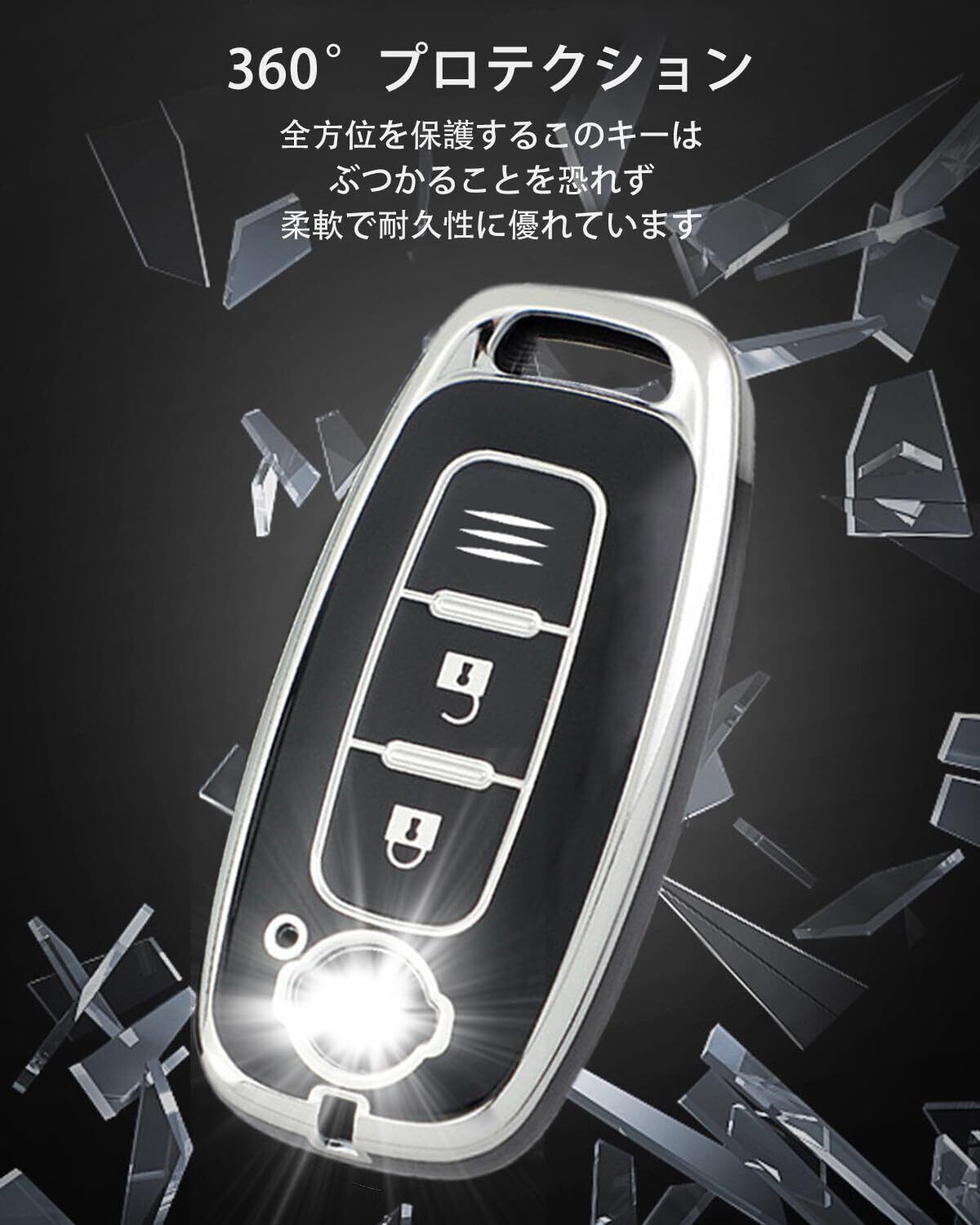 上質なTPU素材で360度保護:ホンダキーケース 選りすぐりのTPU素材を採用し、柔軟性と耐久性を兼ね備えています。全方位からの保護を実現し、キーを汚れ、水、そして衝撃から守ります。長期間使用しても、押しボタンの感触はそのままに、キーを新品のような状態に保ちます。