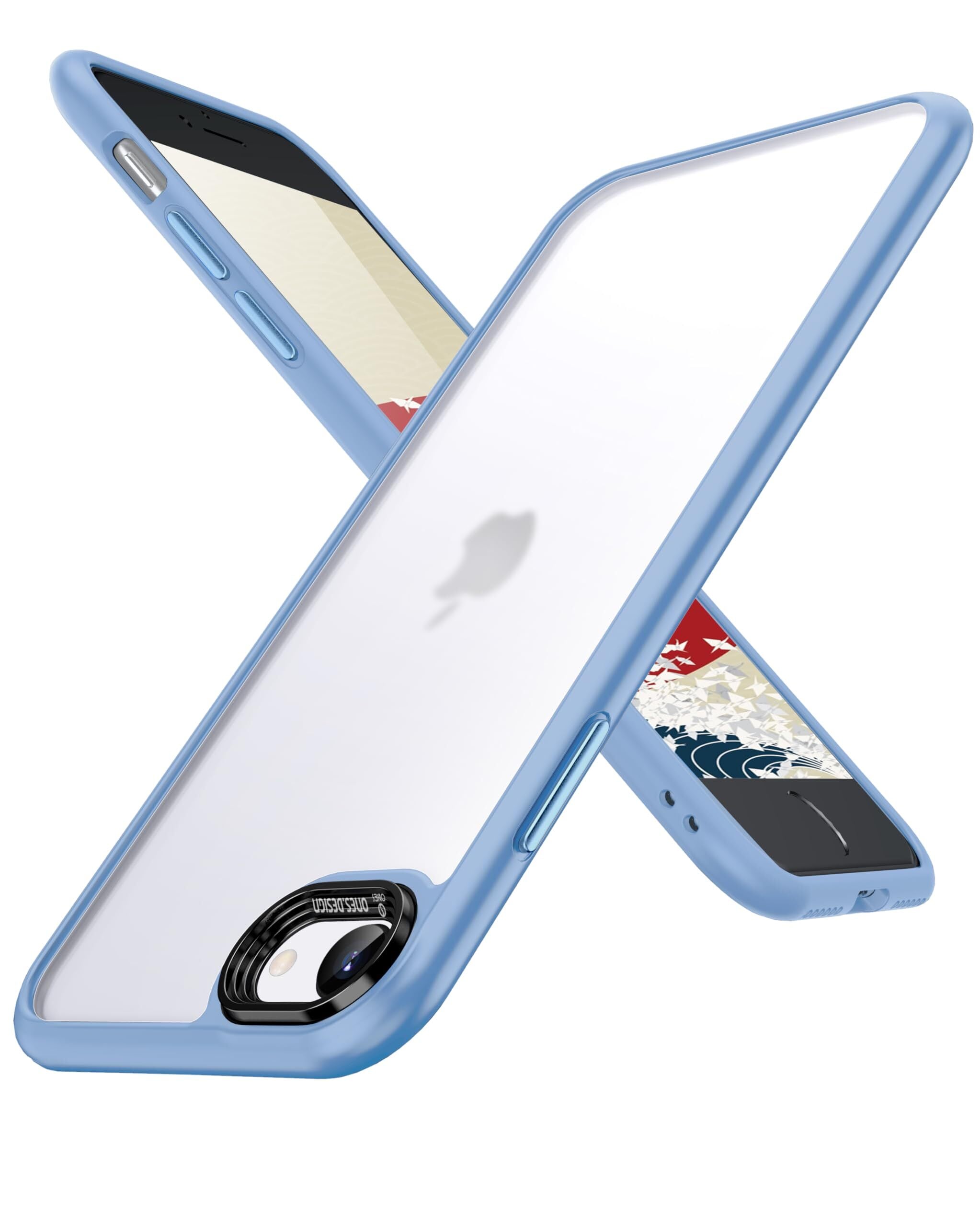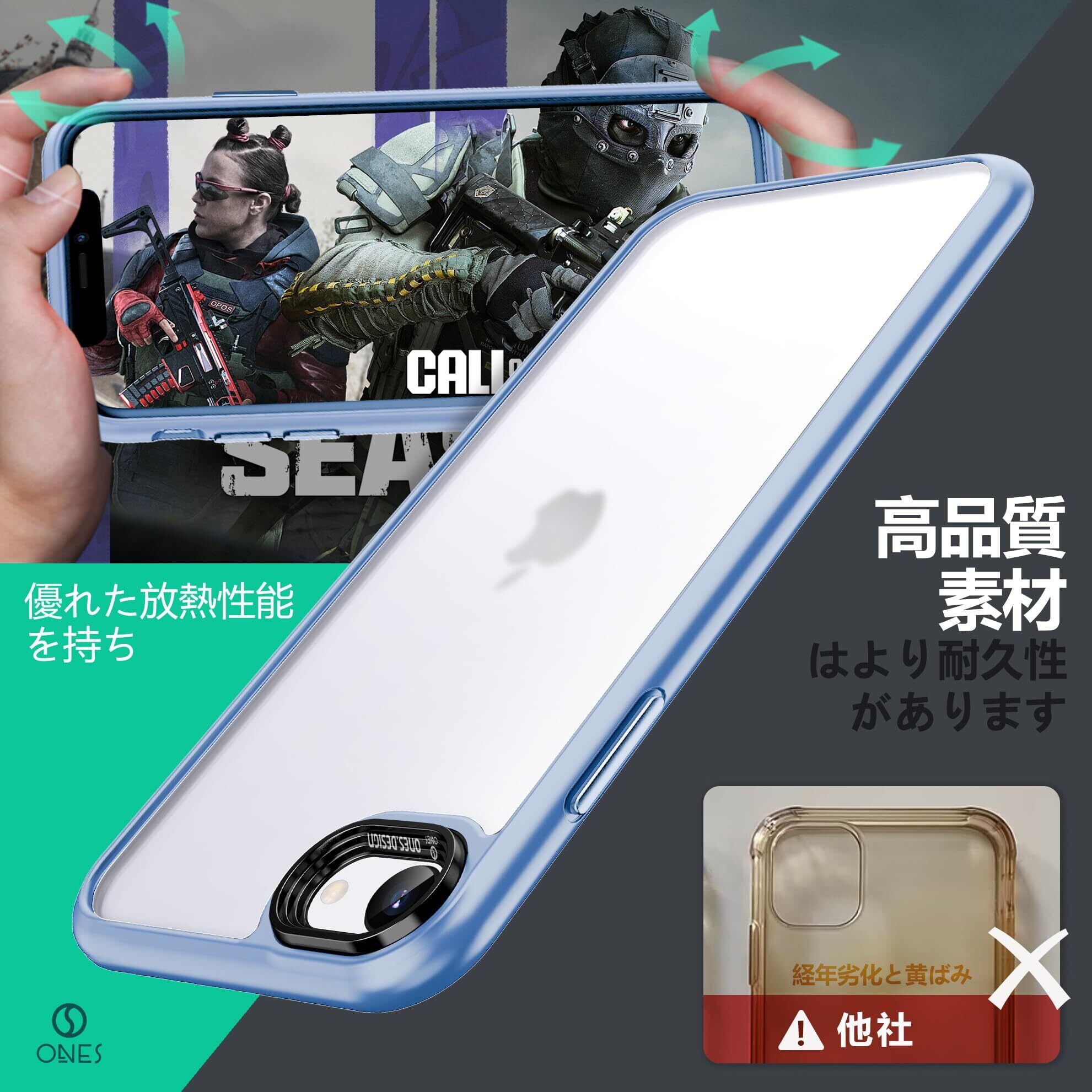 【 強化レンズ保護、合金ボタン、エアバッグ 】 ONES 艶消し iPhone Se3 Se2 Se 8 7 ハードケース 米軍MIL規格 超耐衝撃 【 ブルー·衝撃吸収シリコンバンパー ✚ 透明·マット感·強化PCガードボード 】 指紋防止 滑り止め 画面保護 すり傷防止 黄変防止 つや消し Qi充電 薄型 レコード盤風 高級 カバー
