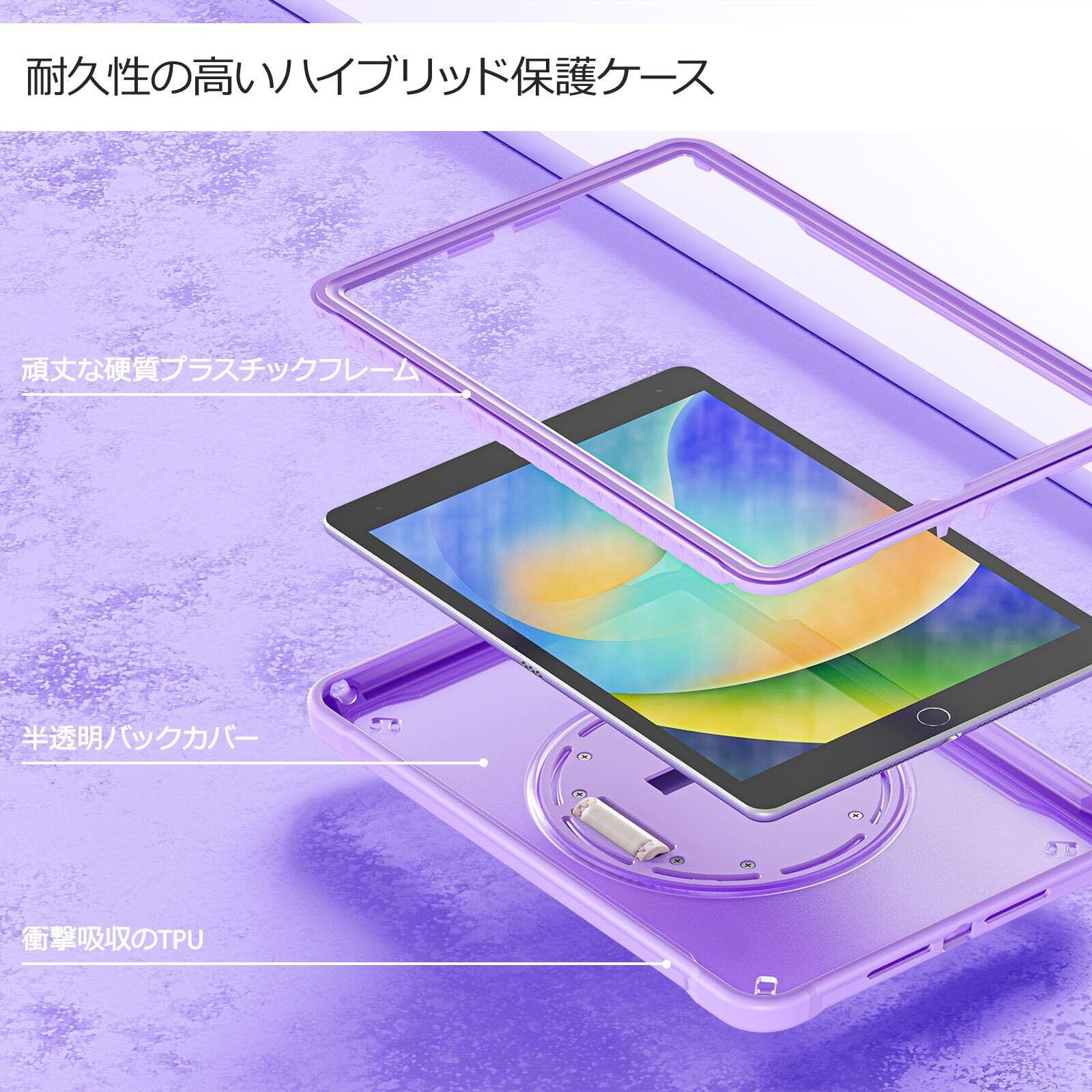 ProCase iPad 9/8/7 ショルダーケース 10.2”肩掛け式 子供用 耐衝撃 半透明カバー ペン収納 360°回転スタンド 手首付き 3層保護 (パープル)