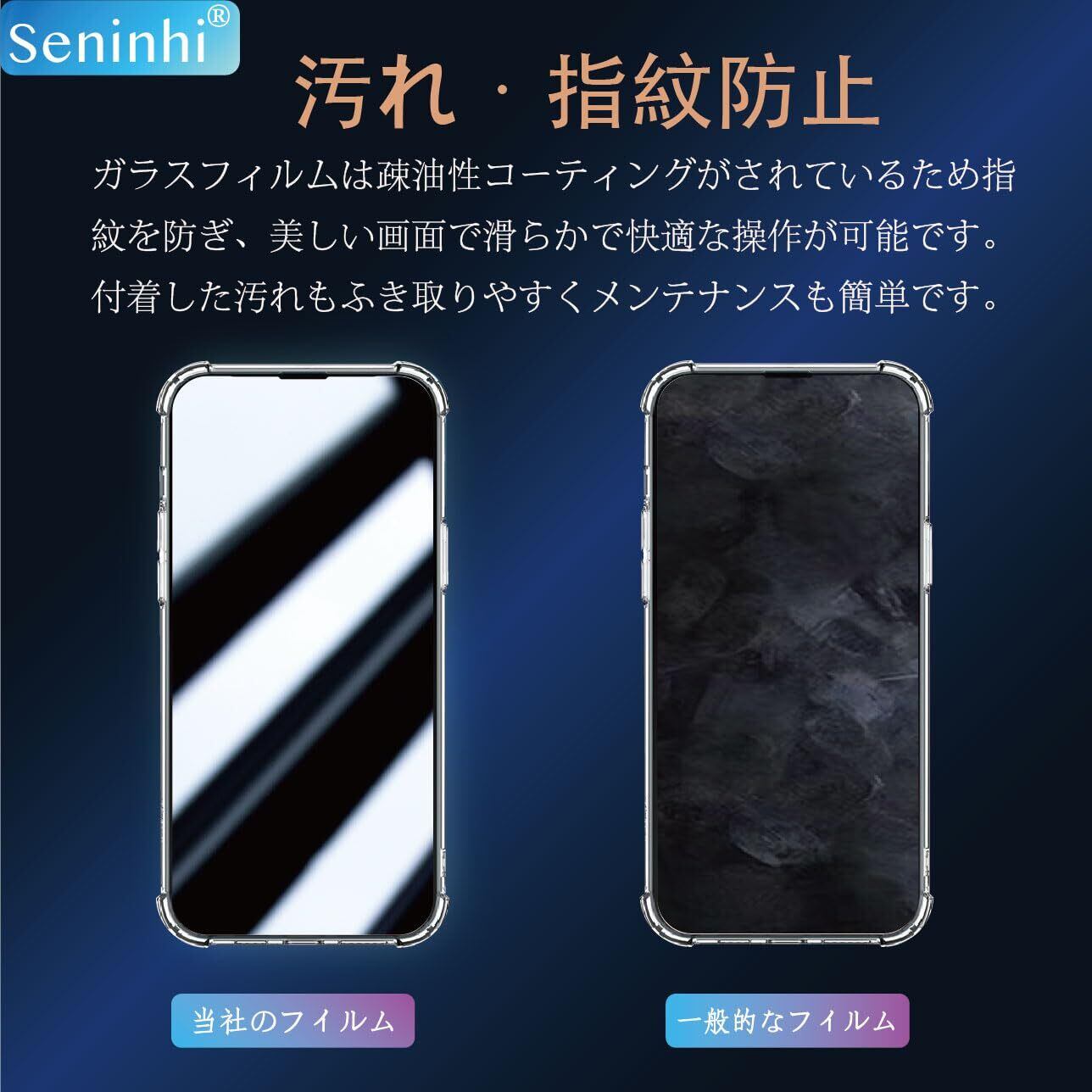 【貼り付けやすい・油防止・指紋防止】seninhi強化フィルムのセットには、位置決め用のガイド枠を付属しておりますので、位置決めが簡単になり、フィルムの自動吸着機能を使って初心者さえも簡単に貼り付けることができます。更に気泡も入りにくいです。フィルムを貼る前に、ホコリ取りシールで細かいホコリを取り除き、気泡の防止をお勧めします。更に私たちの強化ガラスフィルム表面にナノポリマーコーティングを設計しており、これにより油防止、指紋防止できます。汚れや油などが付いでも、簡単に軽くだけできれいになります。
