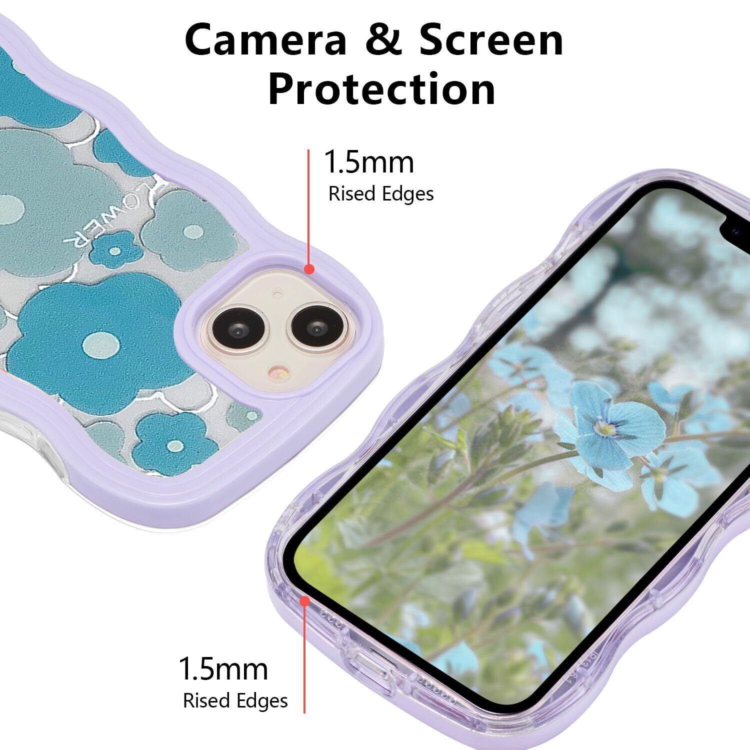 QLTYPRI iPhone 14ケース iPhone 13ケース クリア TPUカバー おしゃれ 韓国 可愛い 透明 薄型 軽量 耐衝撃 スマホケース ワイヤレス充電対応 ストラップホール付き アイフォン 14/13 ケース 6.1インチ 対応 - パープルフレーム & ブルー 花柄