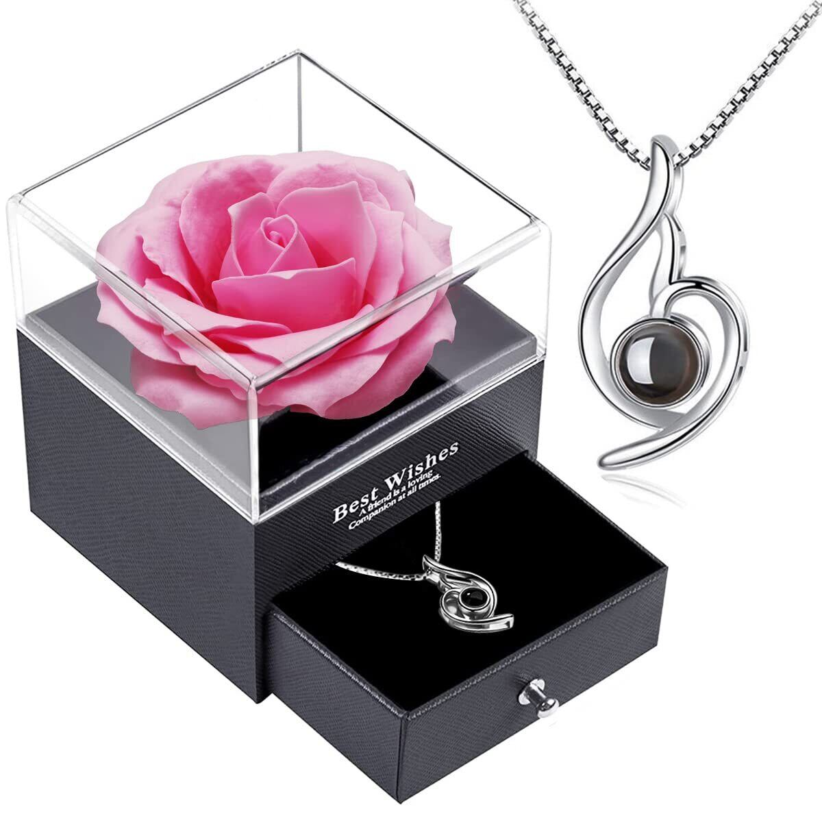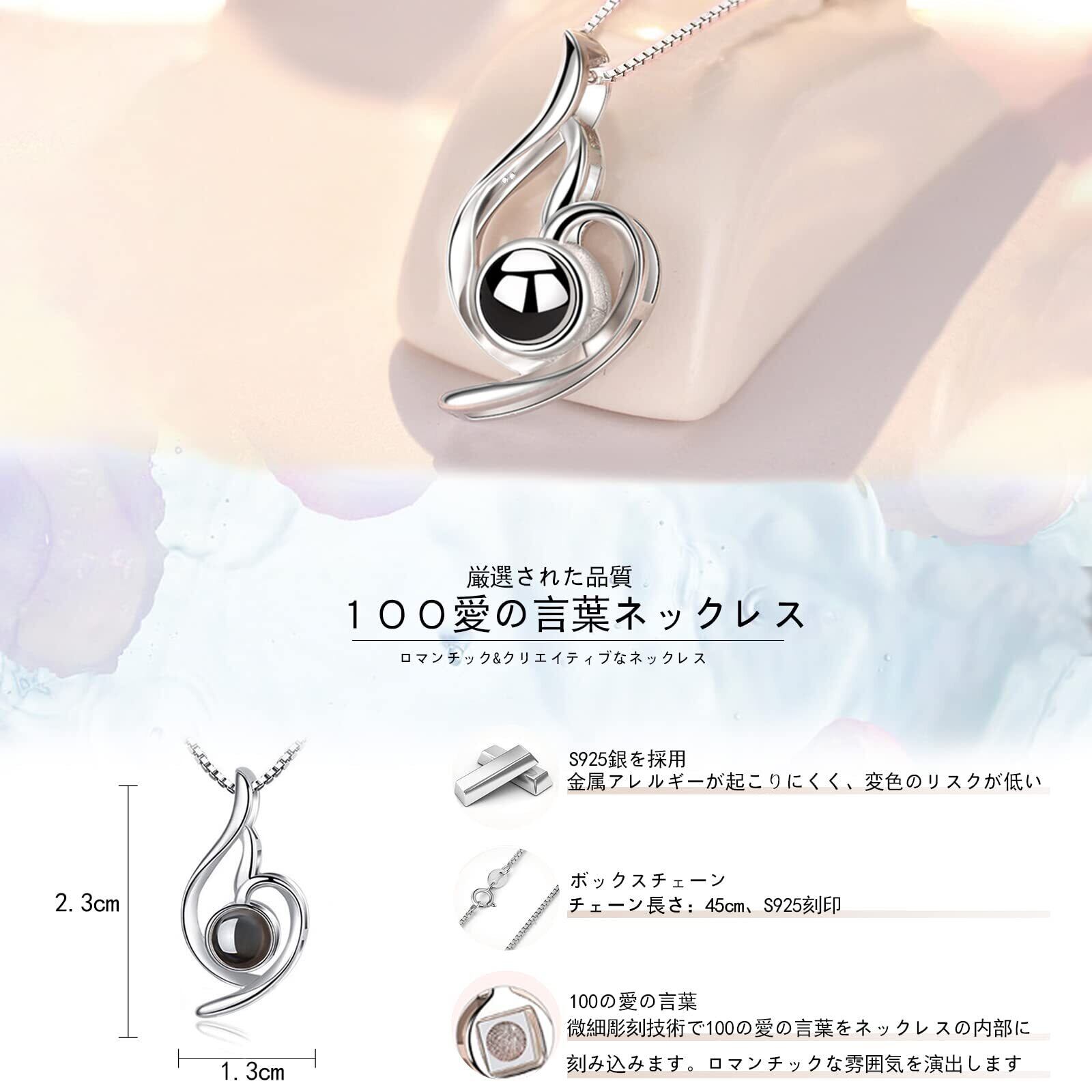 バラとネックレスのプレゼントセットセット内容:ソープフラワーバラのボックス*1、S925銀100言葉ネックレス*1、パッキング*1.大輪の薔薇とレディースネックレスを組み合わせましたローズボックスプレゼントセット。ネックレスはシルバー925で作られています。ハート型の中に丸いされた投影石が入っている、どんな年齢に合わせたハート型デザインを採用し、可愛くてファッション。投影石で100の愛の言葉を見える、ロマンチを演出しています。完璧なネックレスをするために、シルバー925銀で多層メッキ加工を施しましたの光沢が高く、体に優しくてアレルギー反応が起こりにくく、金属アレルギーの方や敏感肌の方でも安心してご利用をいただけます。