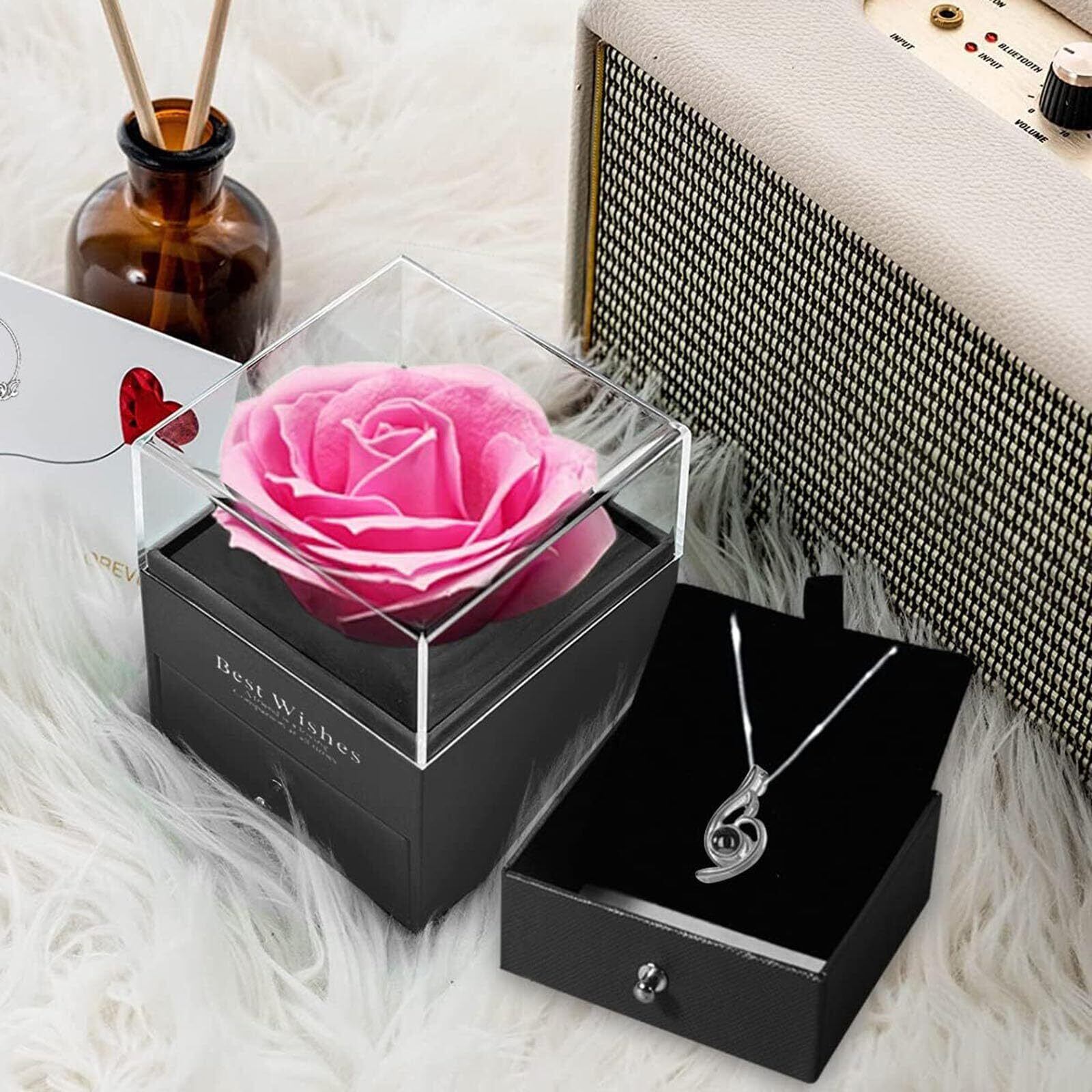 実用的な感謝と愛のプレゼントこれは小さなジュエリーケースとしても使えます。ネックレスだけでなくちょっとしたサプライズアイテムを入れたり、ローズボックスは普段のインテリアの置物としても使えます。ソープフラワーが目を引くジュエリーケースに入っているので、女性へのプレゼントにこれ以上のものはありません。誕生日プレゼント、結婚記念日、クリスマス、母の日、ホワイトデー、結婚祝い、結婚式のギフト。妻、彼女など女性向けのプレゼントです。母親への感謝の贈り物にぴったり。ご自分へのご褒美はもちろん。