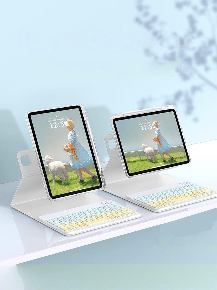 360度回転 iPad キーボード ケース マウス付き グラデーションカラーキーボード iPad ケース キーボード付きマグネット分離式 透明 クリア 背面カバー 縦置き 横置きスタンド ペン収納