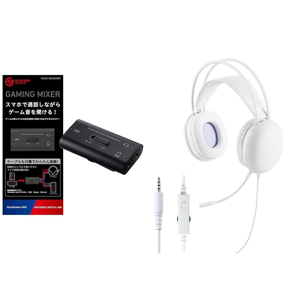 【+LEDヘッドセット】エレコム ゲーム用ボイスチャットミキサー スマホ通話しながらSwitch/PS5/PS4のゲーム音を聞けるデジタルミキサー HSAD-GM30MBK&エレコム ゲーミングヘッドセット 有線 3.5mm LED ライト PS5/PS4 switch対応 軽量 ノイズ軽減 ボリュームコントローラー付き ホワイト HS-G09STWH
