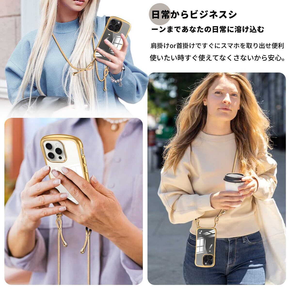 iPhone 15 ProMax 用 ケース ショルダー クリア カバー 肩掛け 首掛け ストラップ付き 斜めかけ 縄掛け iphone15promax ケース 可愛い かわいい 韓国 薄型 軽量 透明 耐衝撃 シリコン TPU バンパー メッキ加工 アイフォン 15promax スマホケース ゴールド