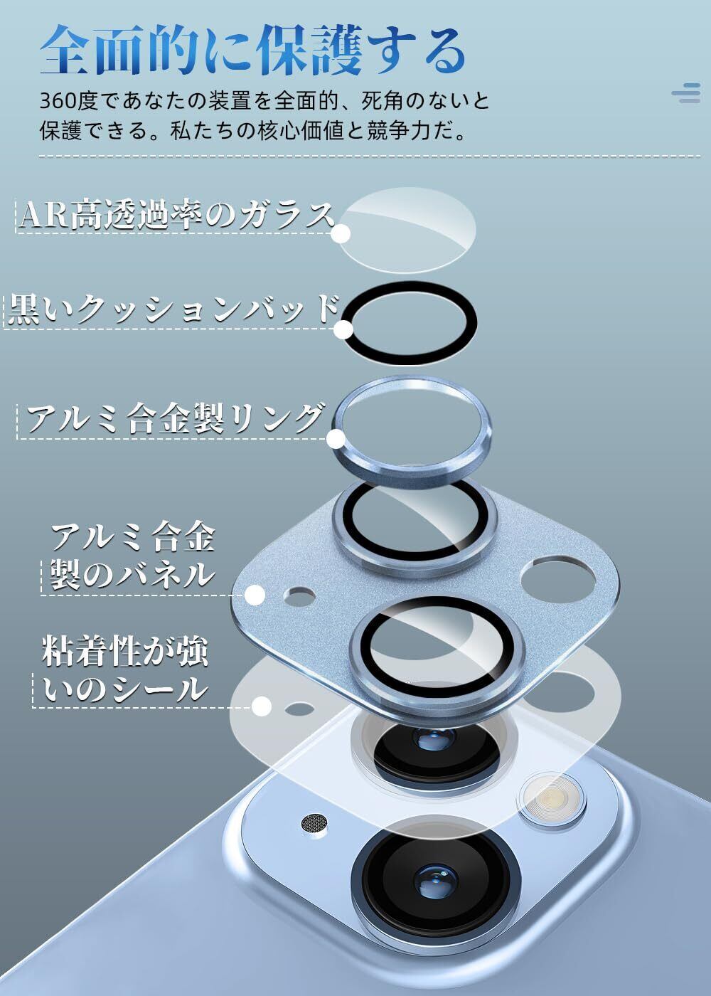 【特価セール】Kakuki For iPhone 15 /iPhone 15 Plus カメラフィルム アルミ合金製+AR高透過率強化ガラス アイフォン15プラス/ アイフォン15 一体型レンズ保護フィルム 耐衝撃 露出オーバー防止 アルミ合金 カメラカバー (iPhone 15/iPhone 15 Plus, ブルー) | わくわくSHOP