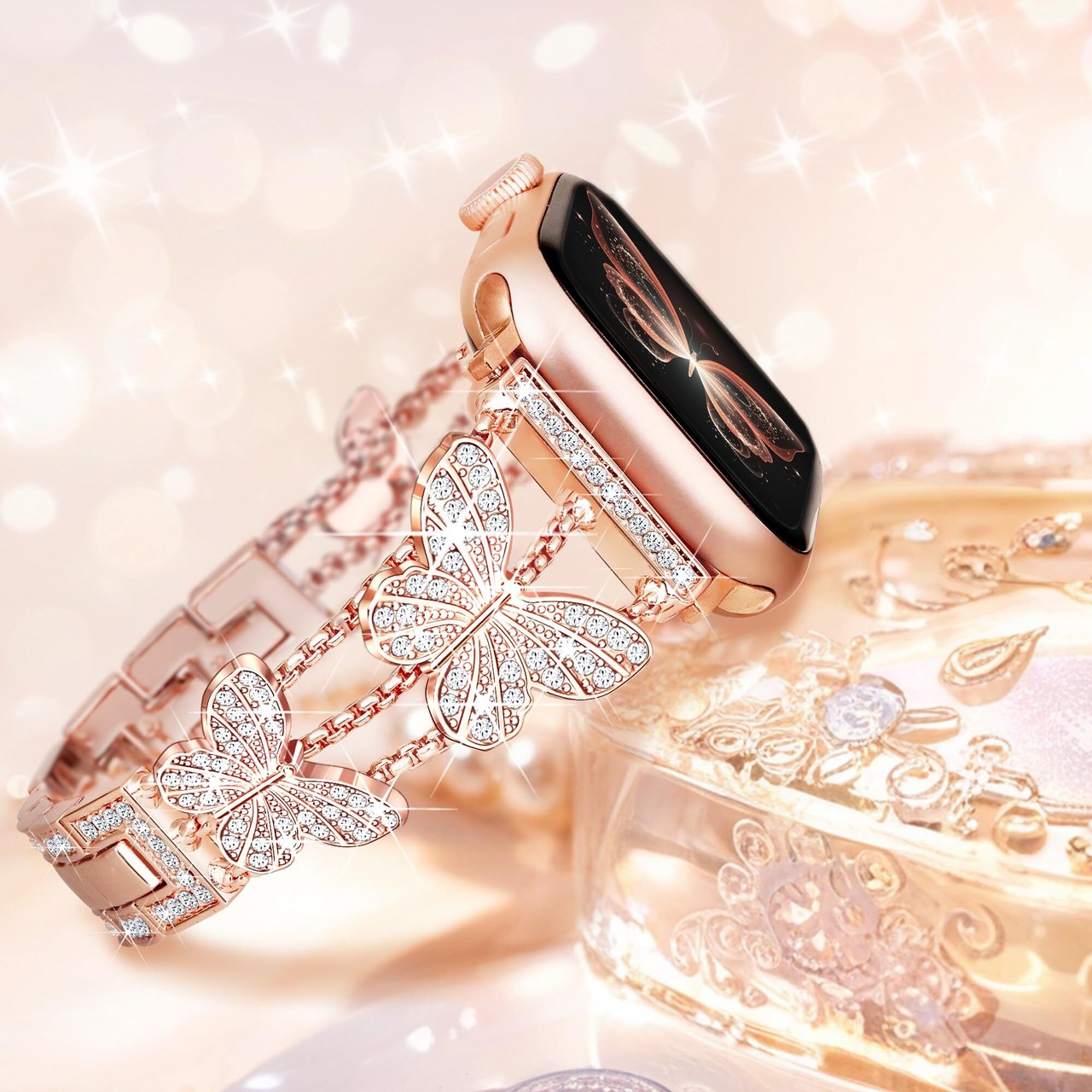 [SIBOYL]キラキラのある蝶のベルト互換うアップルウォッチ バンドレディース46mm 45mm 44mm 49mm 42mm(Series 3/2/1)、夏 蒸れない可愛いの対応Apple Watch ベルト 、調整が簡単の互換アップルウォッチ バンド レディース、 おしゃれ人気あっふウォッチバンド、対応Apple Watch 11 10 Se 9 8 7 6 5 4 3 Ultra 3 2 1-ローズゴールド