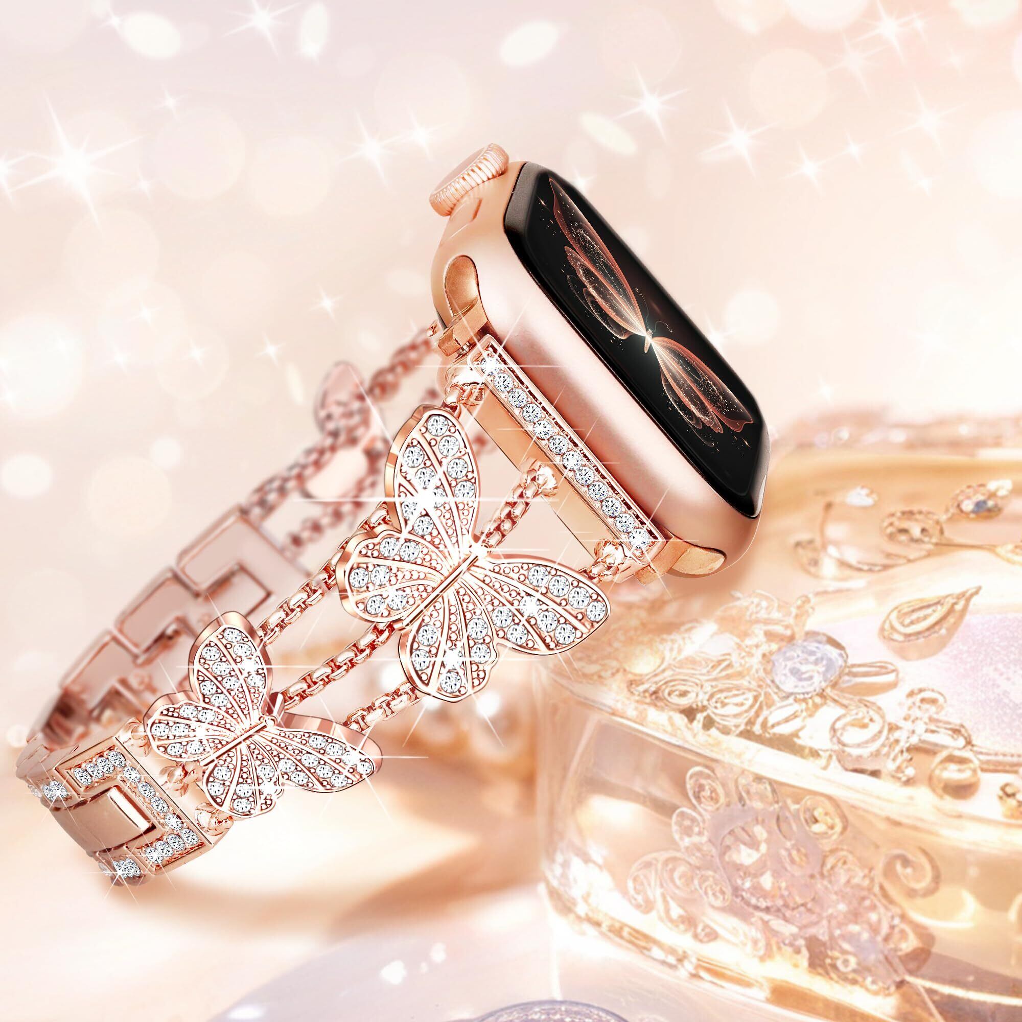 【人気商品】[SIBOYL]キラキラのある蝶のベルト互換うアップルウォッチ バンドレディース46mm 45mm 44mm 49mm 42mm(Series 3/2/1)、夏 蒸れない可愛いの対応Apple Watch ベルト 、調整が簡単の互換アップルウォッチ バンド レディース、 おしゃれ人気あっふウォッチバンド、対応Apple Watch 11 10 Se 9 8 7 6 5 4 3 Ultra 3 2 1-ローズゴールド | わくわくSHOP