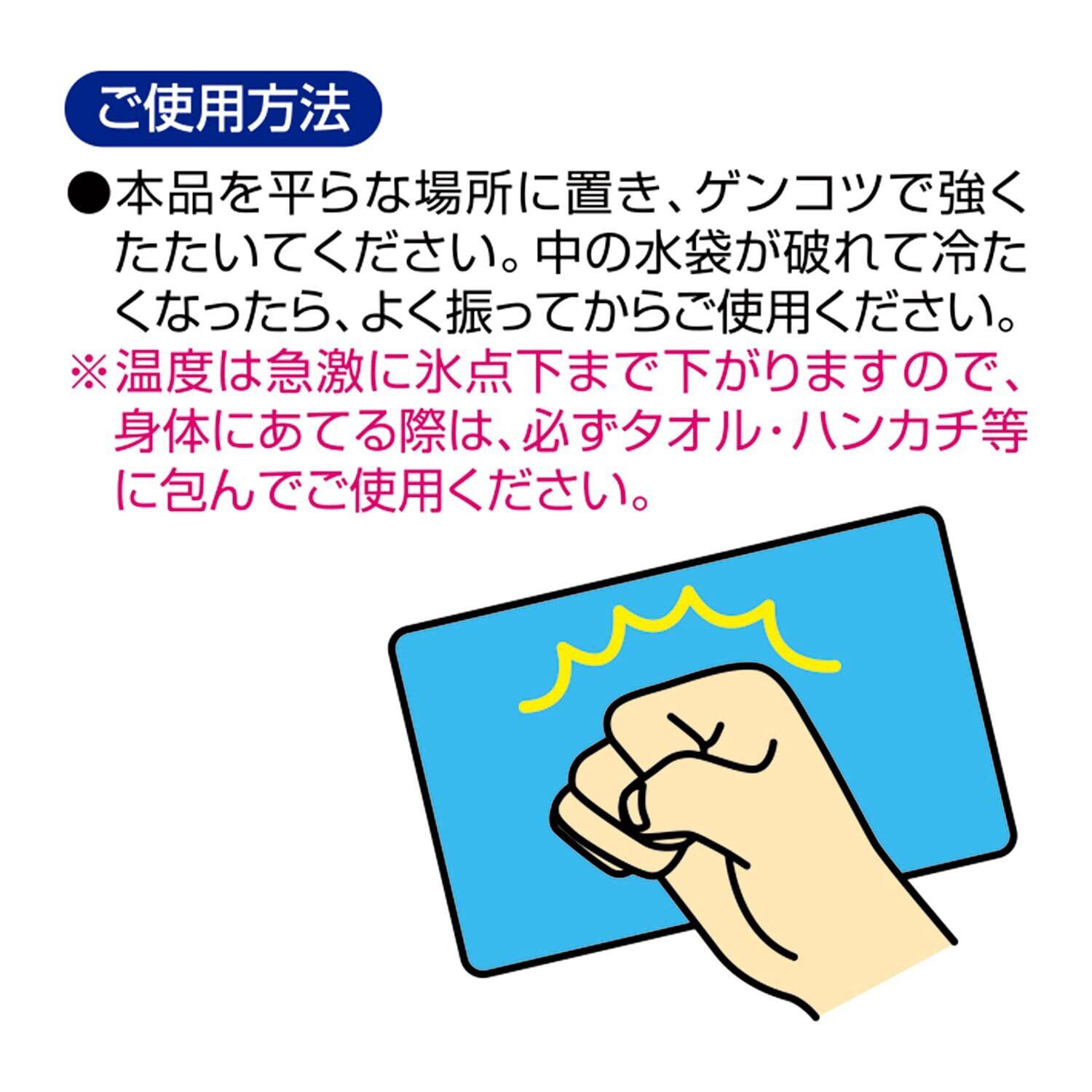 【使い方】本品を平らな場所に置き、ゲンコツで強くたたいてください。中の水袋が破れて冷たくなったら、よく振ってからご使用ください。※温度は急激に氷点下まで下がりますので、身体にあてる際は、必ずタオル・ハンカチなどに包んでご使用ください。