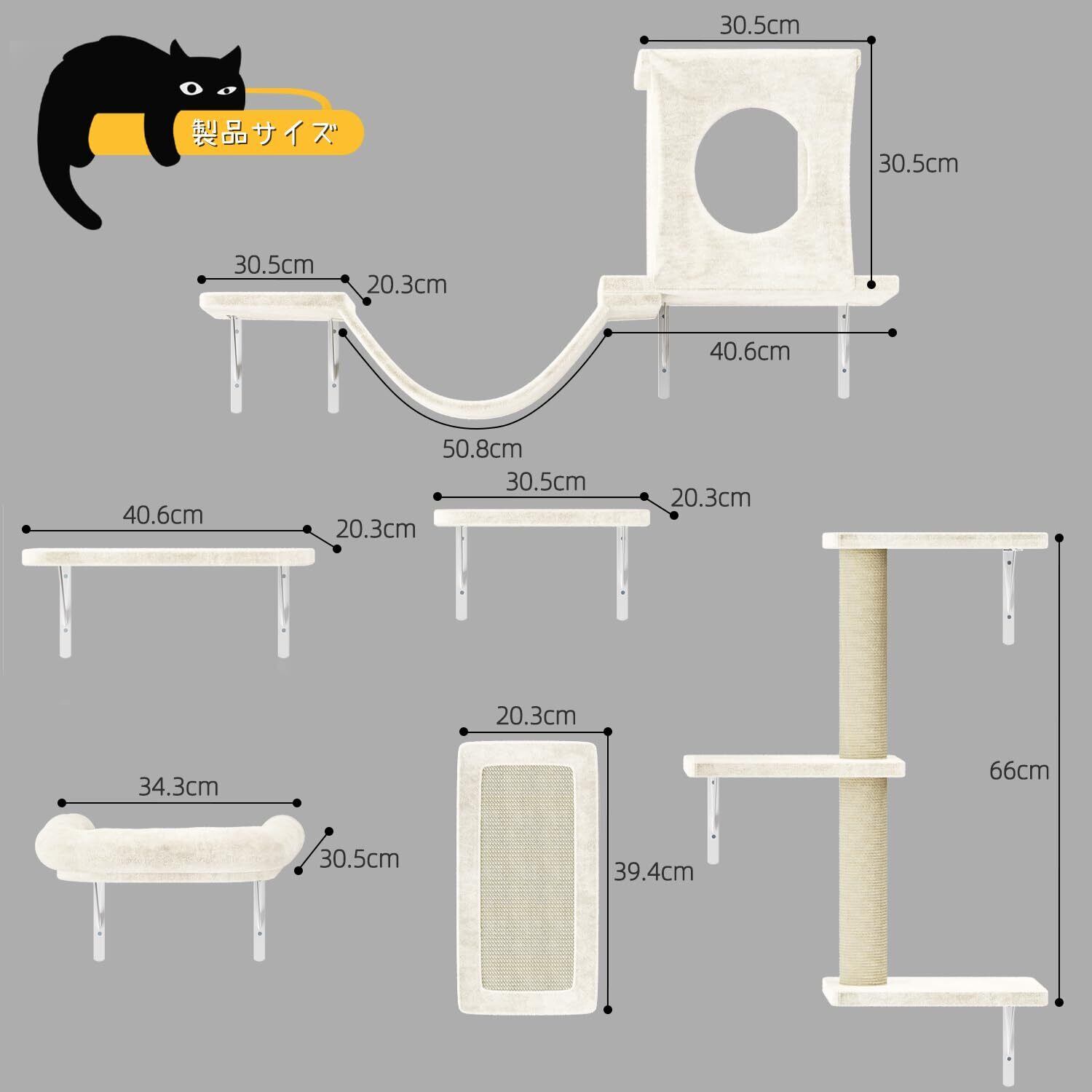 【豪華な猫用家具6点セット】パッケージには猫用スクラッチボード39*20cm(長さ*幅)*1、 キャットツリー66cm(高さ)*1、 キャットステップ*2(長さ*幅:40*20cm*1+30*20cm*1)、猫の巣34*30cm(長さ*幅)*1、猫ハウス40*30*30cm(長さ*幅*高さ)*1+吊り橋50cm長さ(ベッド)*1が含まれいます。当社の壁に取り付けられた猫用シェルフセットには、猫の本能を刺激し、登って(爪を研ぐ)遊びたいという猫の自然な欲求を満たす楽しい環境を提供するために設計された複数のレベルを提供するユニークな遊び構造を備えています。