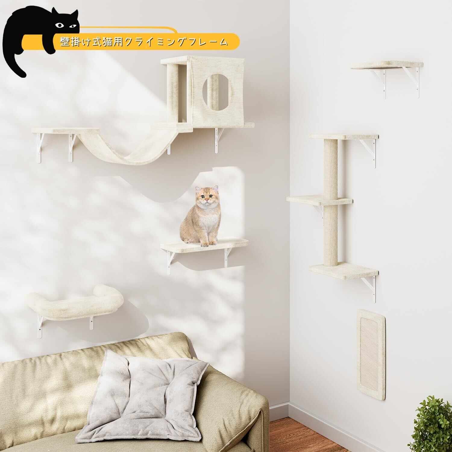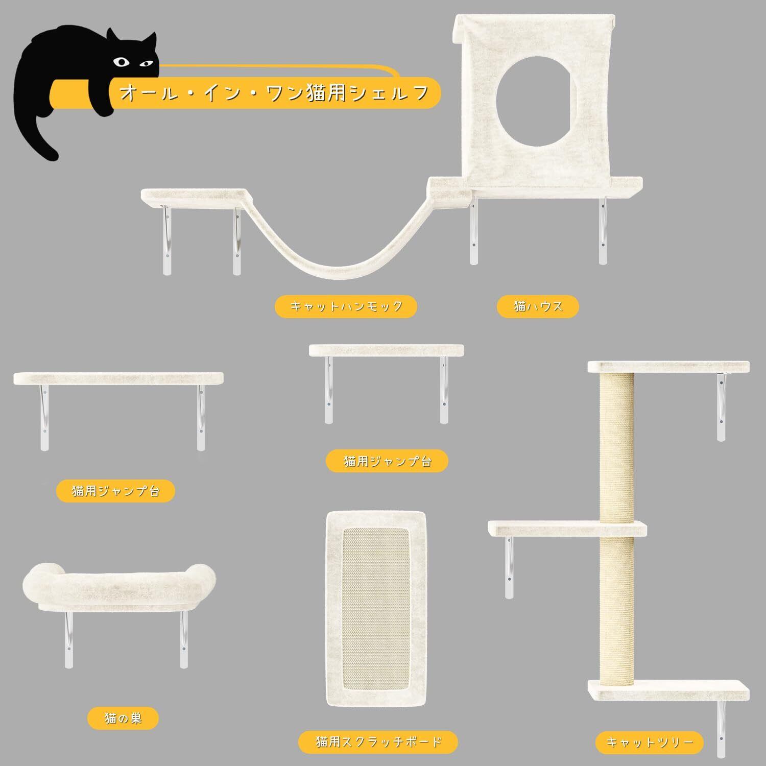 【品質&取り付けやすい】猫用家具セットには壁にしっかりと固定するための高品質な製品と取り付けアクセサリーが付属しているので、お子さまは自分で遊び場を組み立てることができます。詳しい説明書が同梱されており、電動ドリルだけで簡単に取り付けられます!どんな活発な猫でも安全に使用できます。当社の猫用家具は付きです。ご質問や問題がございましたら、お気軽にお問い合わせください。私たちは常に高品質のサービスを確保し、お客様のペットのために快適で楽しい環境を提供することを約束します。