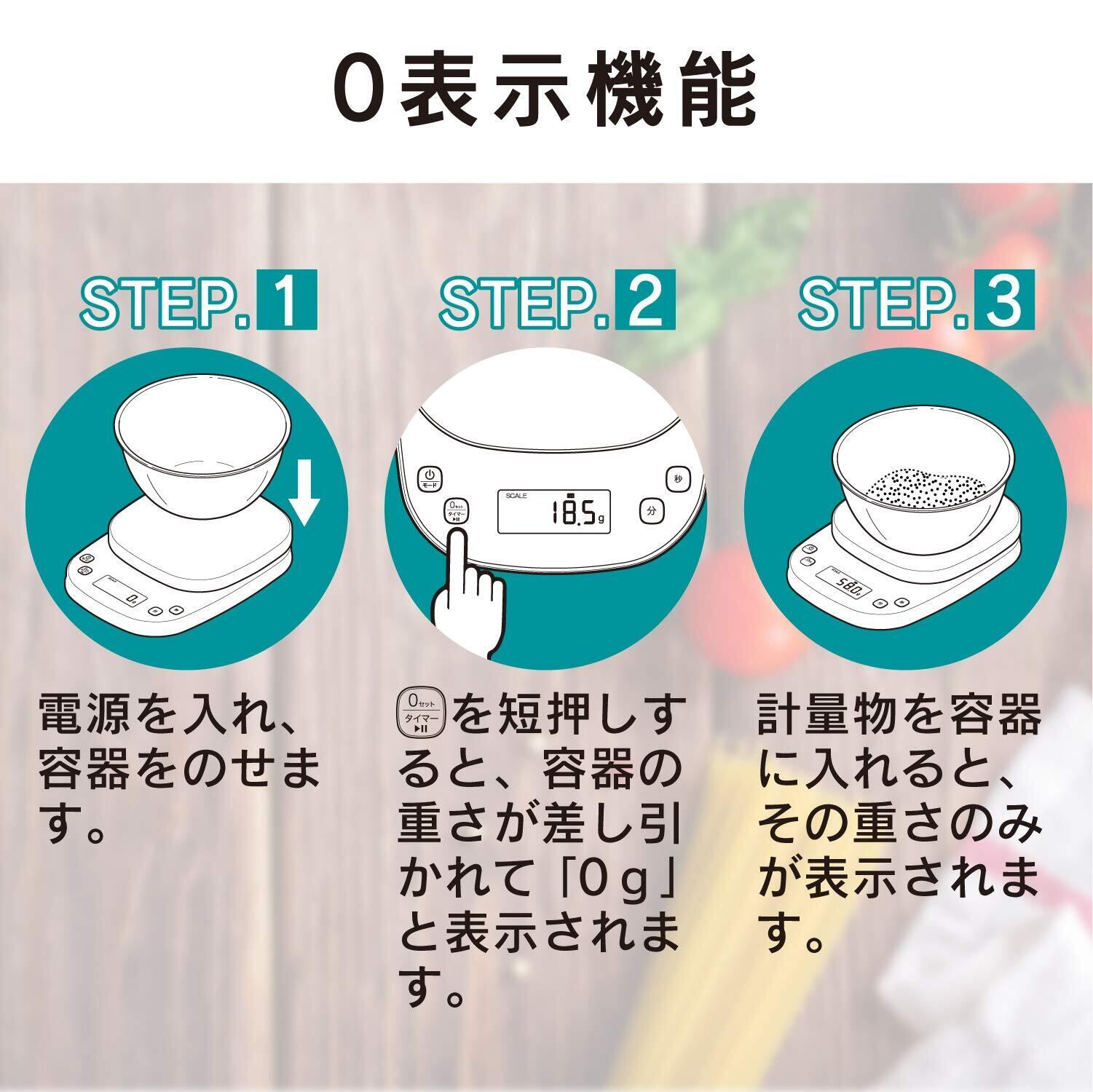 ■ ボウルに入れて計量物を量る際、ボウルを乗せ0gセットボタンを押すことで容器の重さを差し引くことができます。