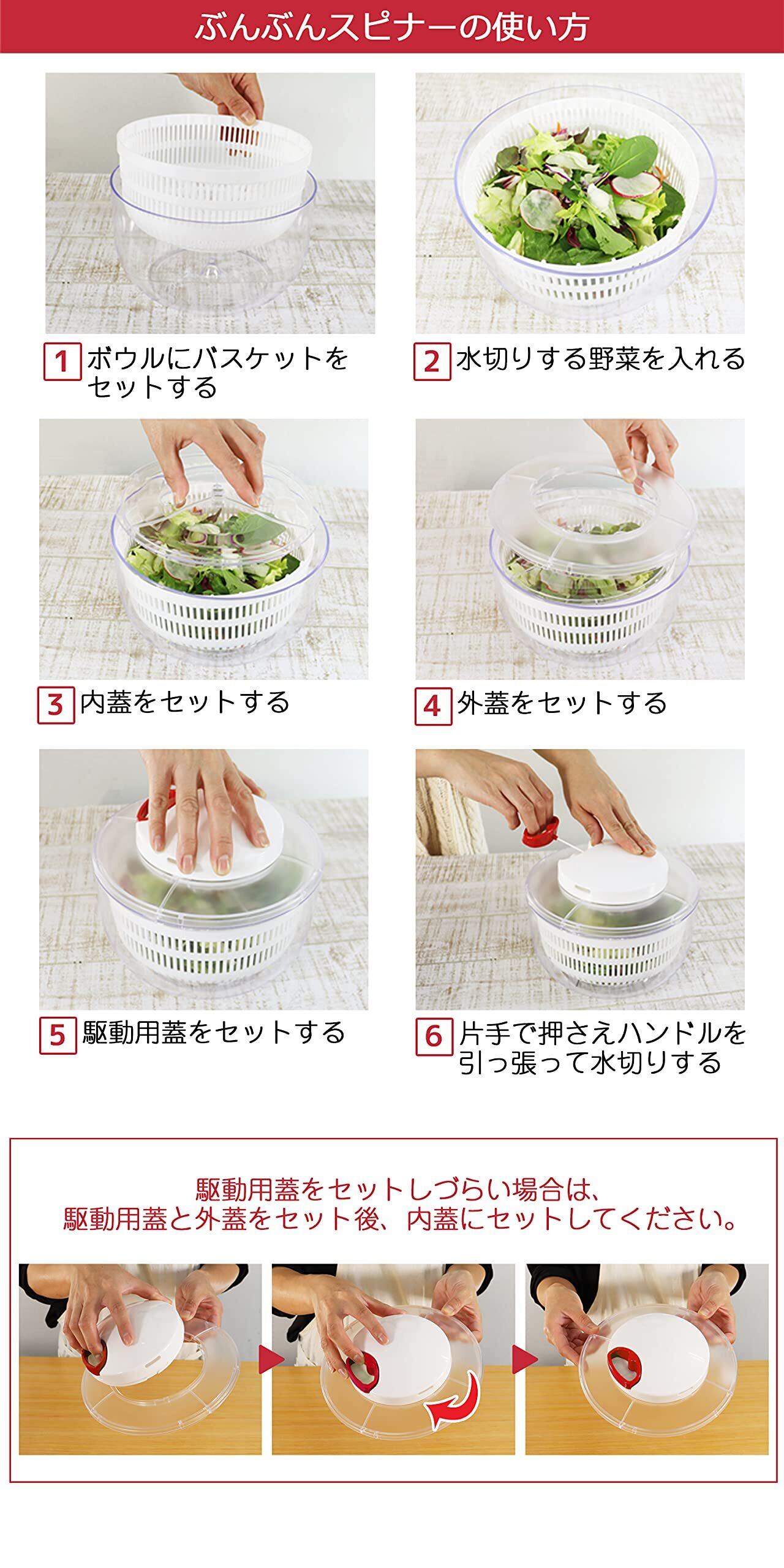 icokka K&A ぶんぶんスピナー ぶんぶんチョッパーの蓋が使える サラダスピナー 野菜水切り器 手動 丸洗い (蓋あり)