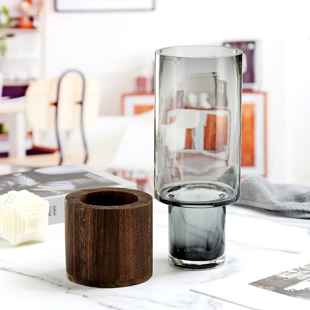 花瓶 ガラス 木製 フラワーベース 北欧 おしゃれ 花器 透明 ブラック グレー 大きい 花びん シンプル 可愛い かわいい インテリア 高さ26cm