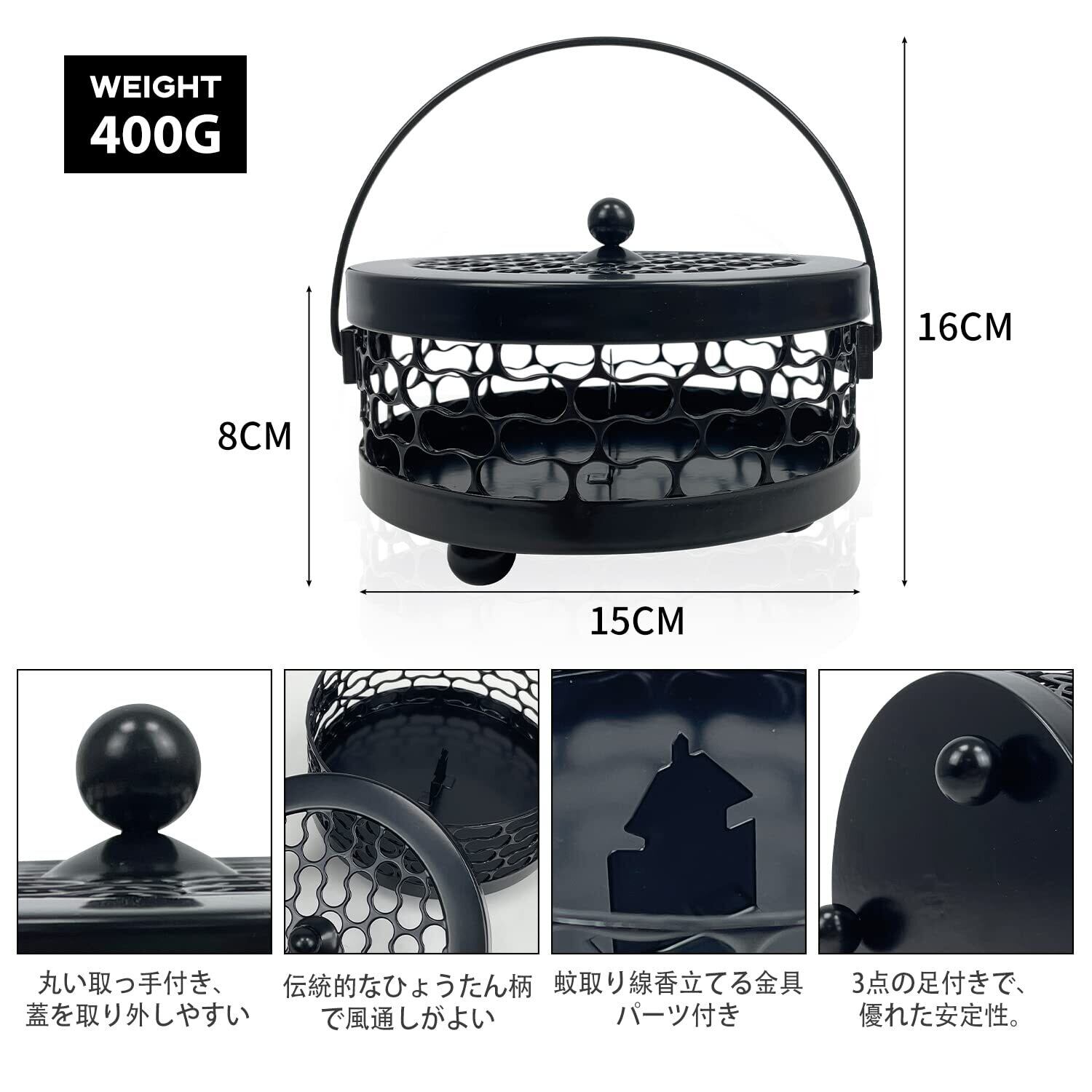 【スチール製】スチール製で重厚感があり、陶器製のものより、丈夫で割れる心配がありません。落ち着いたブラック色でお部屋の印象を崩さずに蚊取り線香を使用することができます。美しいひょうたんの模様で風通しがよい。穴から煙を少しずつ出してくれ、癒やし効果のがポイント。