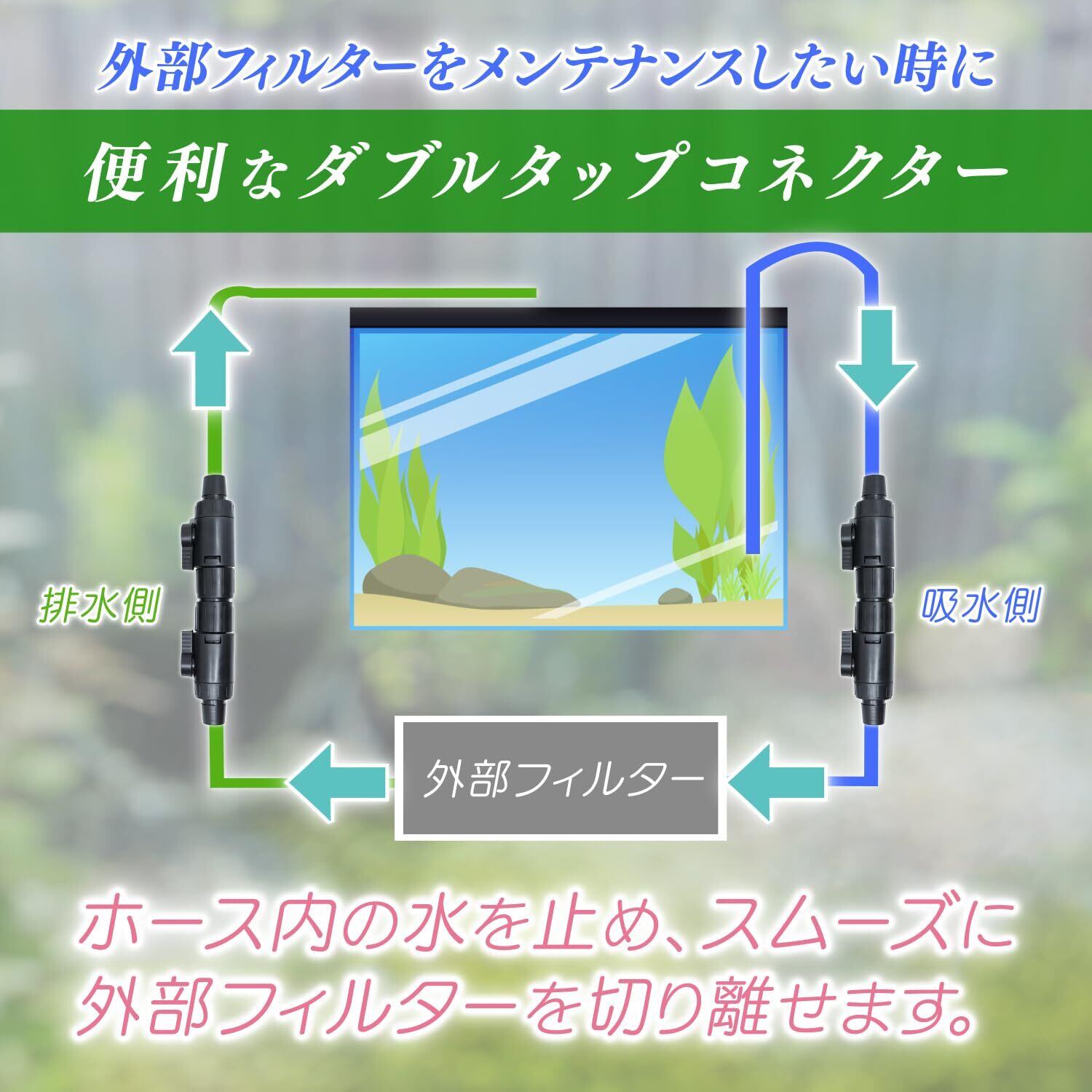 ・外部フィルターとホースを接続するダブルタップコネクターです。外部フィルターの吸水ホースと排水ホース、それぞれの途中にコネクター使い連結させて使用します。
