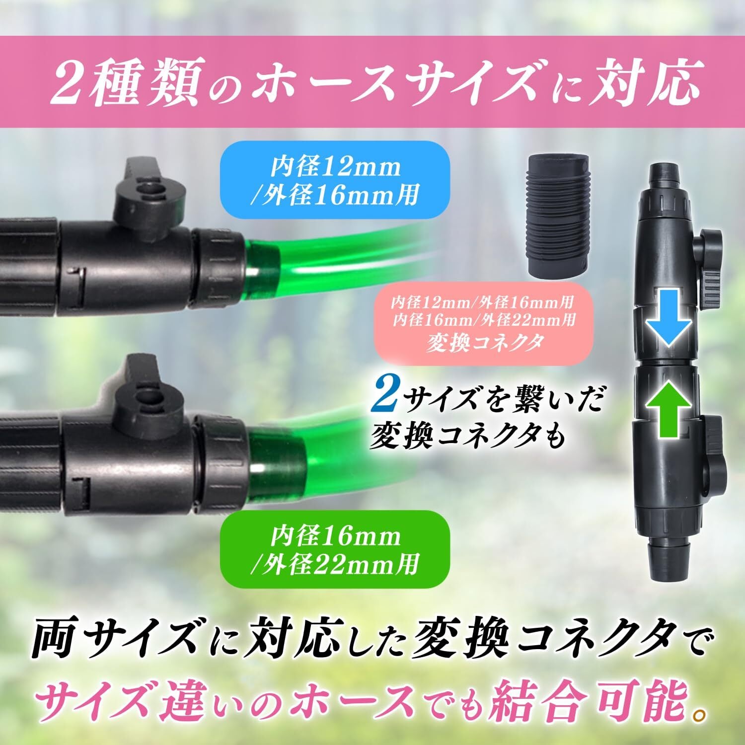 ●[同径コネクター]:ホース径 内径12mm外径16mm用 ●[同径コネクター]:ホース径 内径16mm外径22mm用 ●[異径コネクター(変換用)]ホース径 内径12mm外径16mm ⇔ 内径16mm外径22mm