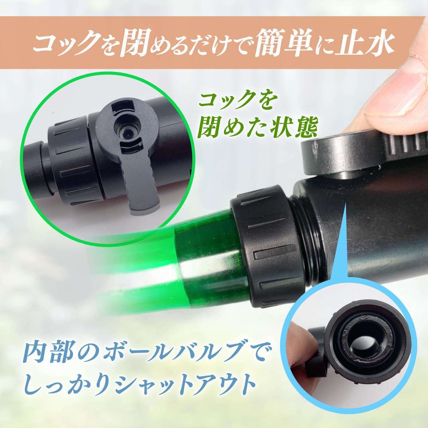 ・コネクターにはコックが付いており、コックをひねると水が止まる仕組みになっているので、水漏れを防ぎながら外部フィルターとホースを切り離すことができます。