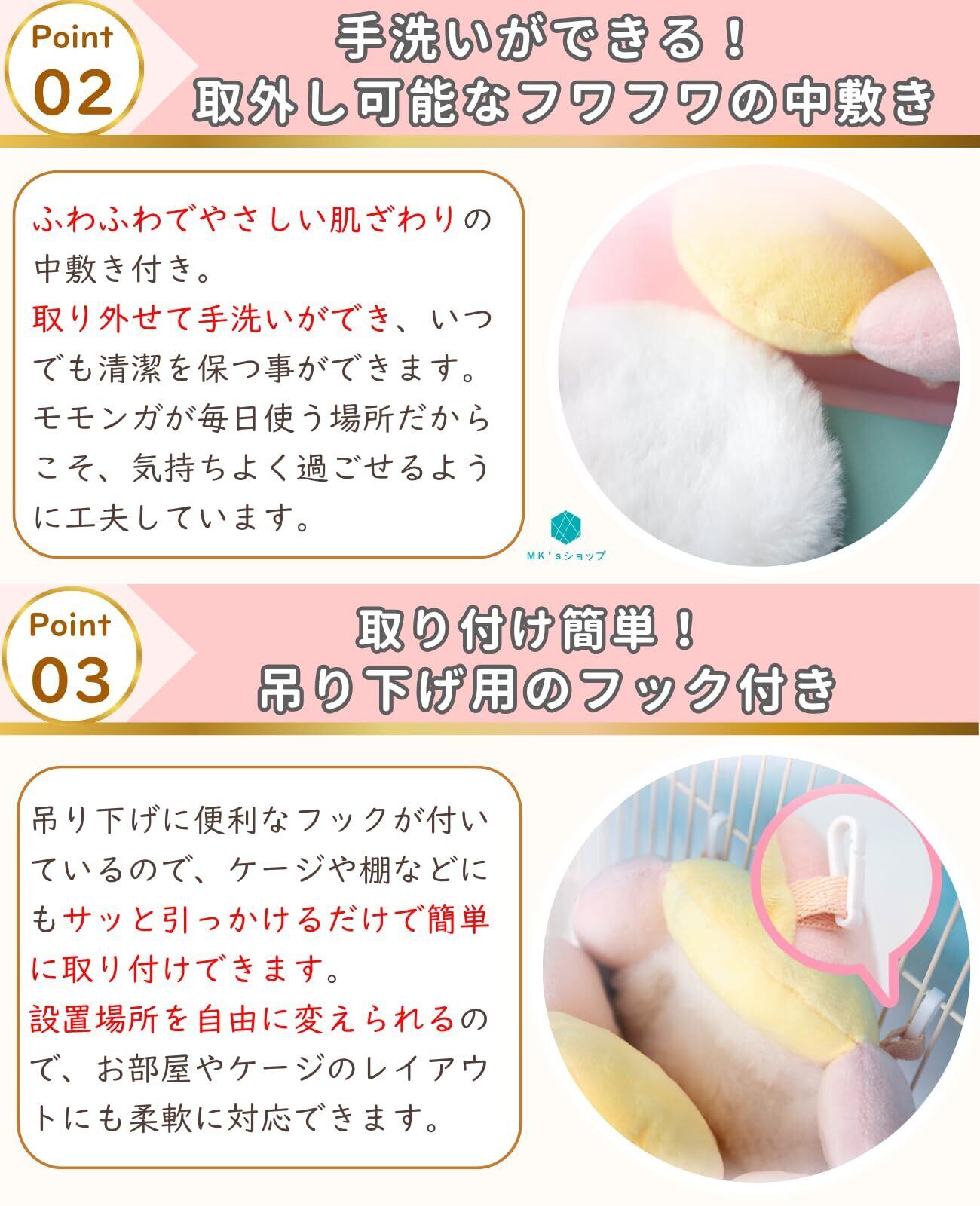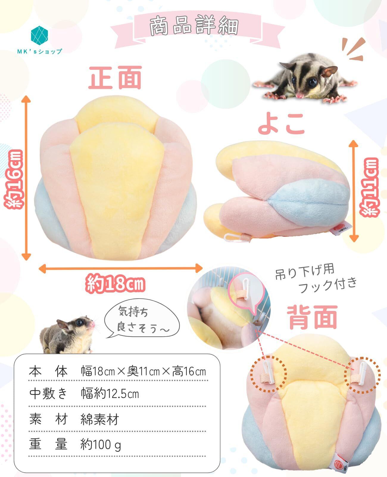 【かわいいデザイン】貝殻の形をしたキュートなデザインのモモンガポーチです。ふんわりとした見た目でケージ内の雰囲気がぱっと明るくなります。 【2Way対応】吊り下げと床置きの両方使える2Wayタイプです。ペットのお好きな態勢に合わせてお使いください。 【取り外せる中敷き 】ふわふわの中敷きは取り外して洗えるので、いつでも清潔を保てます。 【ふわふわ素材】やわからかくて触り心地の良いふわふわ素材なので、爪を引っかける心配もありません。 【商品詳細】サイズ:幅18cm×奥行き11cm×高さ16cm 重量:約100g 素材:綿