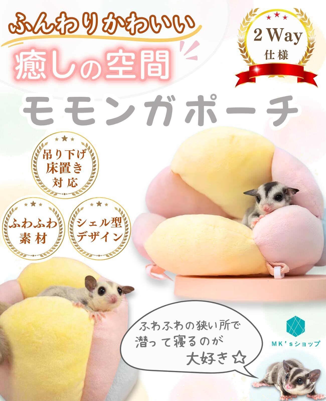 【かわいいデザイン】貝殻の形をしたキュートなデザインのモモンガポーチです。ふんわりとした見た目でケージ内の雰囲気がぱっと明るくなります。