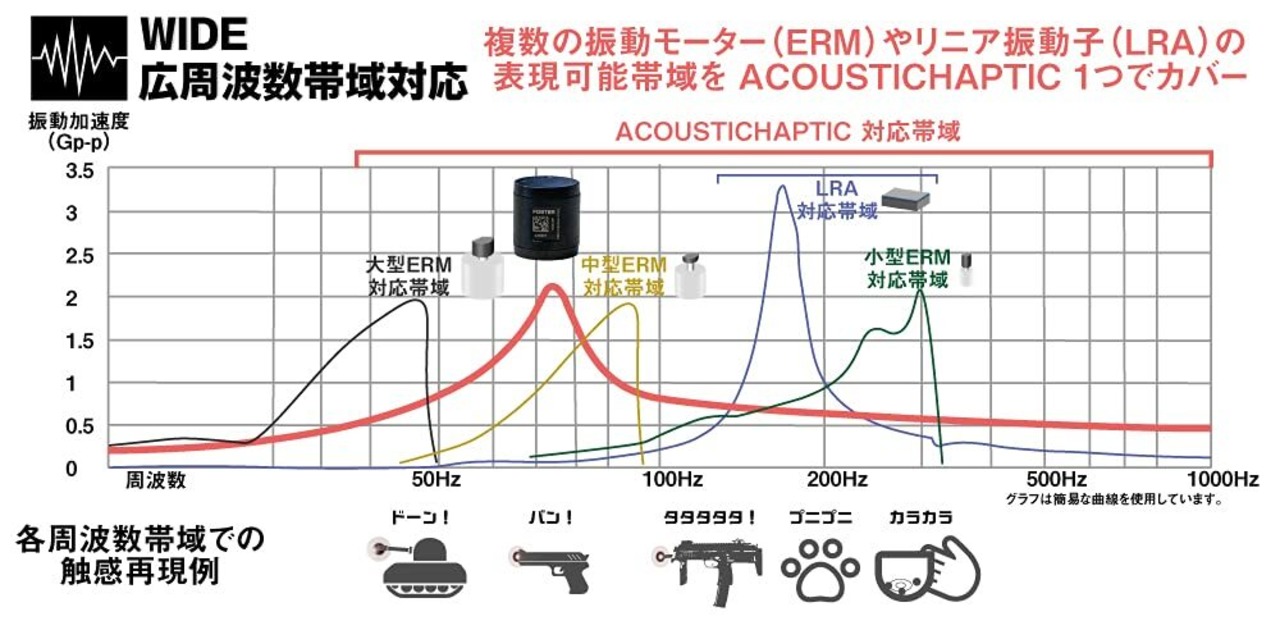 フォスター電機が開発した最新のアクチュエーター「FOSTER ACOUSTICHAPTIC」を採用、従来のモジュールにはない「広域振動」「低遅延」「静粛性」の3拍子併せ持った万能アクチュエーターとして様々な触感を生み出します。