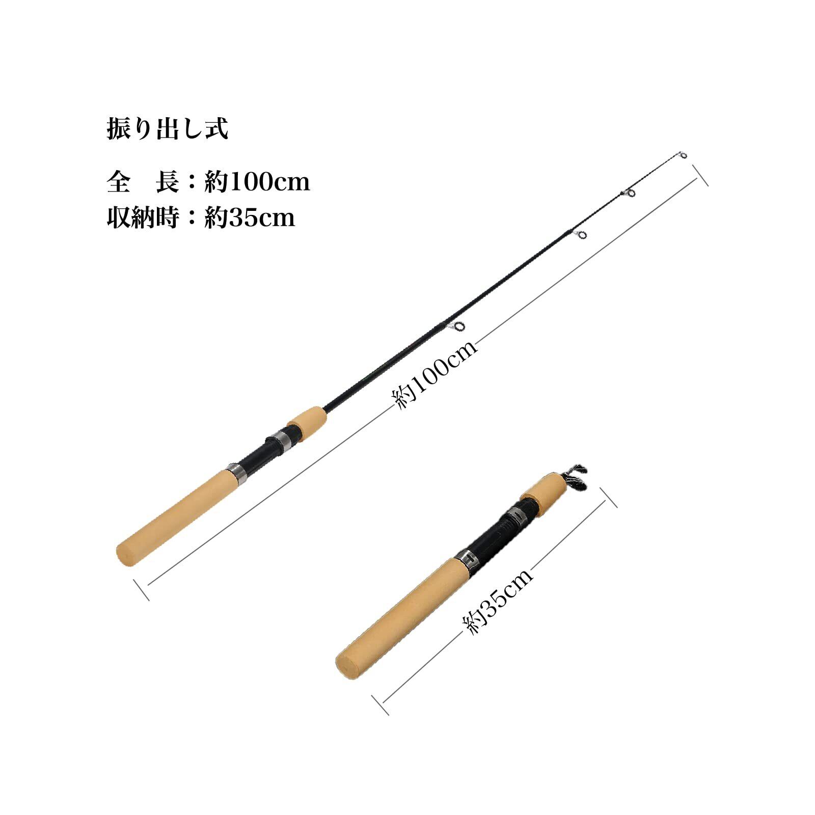 ロッド◆標準全長:約100cm / 仕舞寸法:約35cm/ 重量:約66g/ ガイド数:4 リール◆ギア比:5.2:1 ライン量:約70m ナイロンライン:3号 リールは基本的なスピニングリールと同様の機能になります。ドラグ調整、ストッパー機能等も同様です。サイズは目安として有名メーカーの1500番手程度のサイズになります。 ロッドはカーボン製で、当たりを取りやすく小さな根魚などにもあわせやすい仕様となっております。グリップはEVAになります。収納ケース付きです。 様々な釣りに対応します。ロッドを伸ばし、リールからラインを通しすぐに使用できます。テトラなどの細かいポイント探り釣りから、ヘチ際の落とし込みや穴釣りで、ブラクリ等でのロックフィッシュの釣りに。バスロッドよりは柔らかいですが小物狙いでしたらバス釣り等にも使用可能です