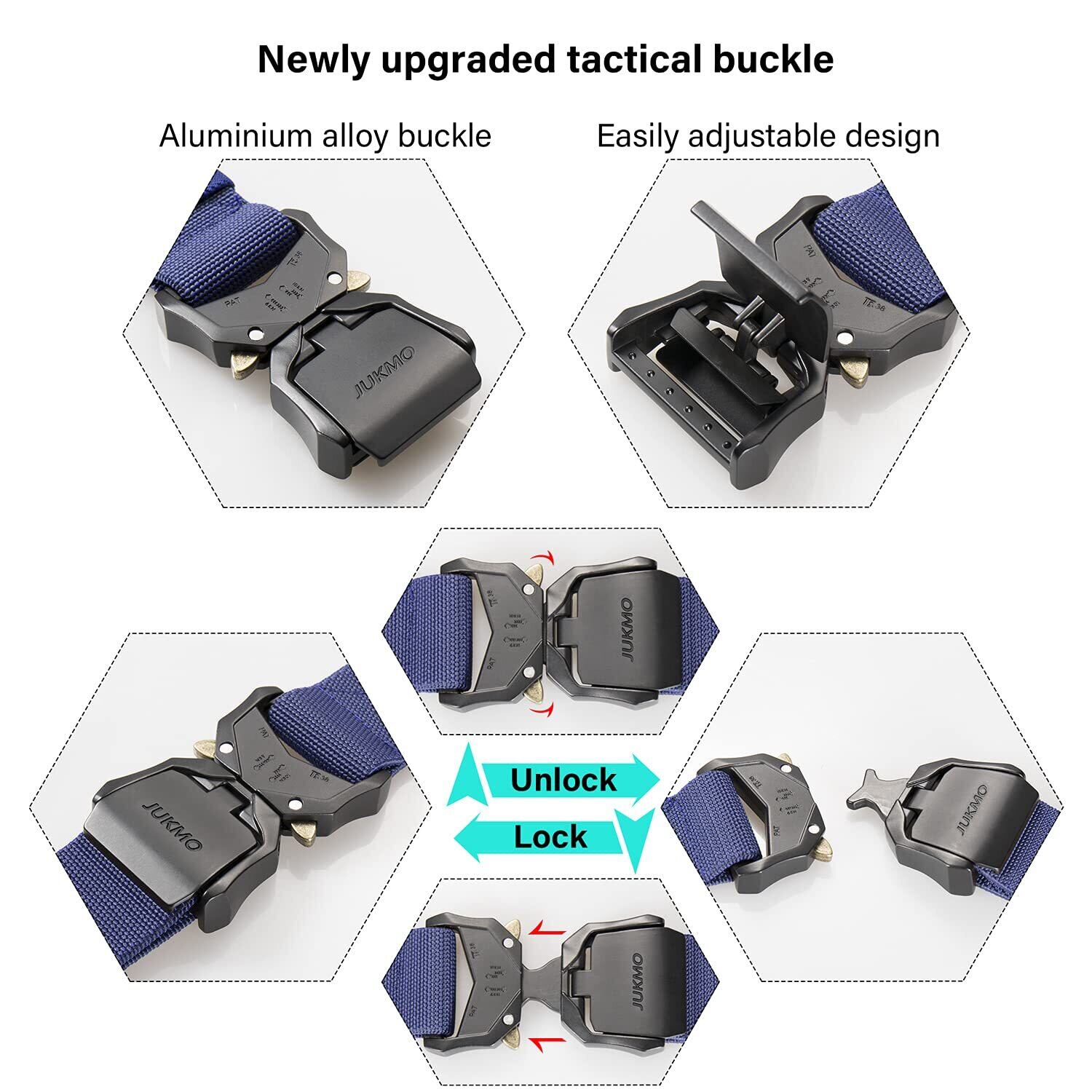 バックルを素早く外せるグレードアップ版: 精巧に彫られた重いバックル、アルミニウム合金、強い荷重能力、さまざまな着用条件を満たすことができます。 アップグレードの部分は、長さ調節が更に簡単に、また完璧にフィットします。 動画で簡単理解できます、当社のタクティカルベルトについての短いビデオをご覧ください。