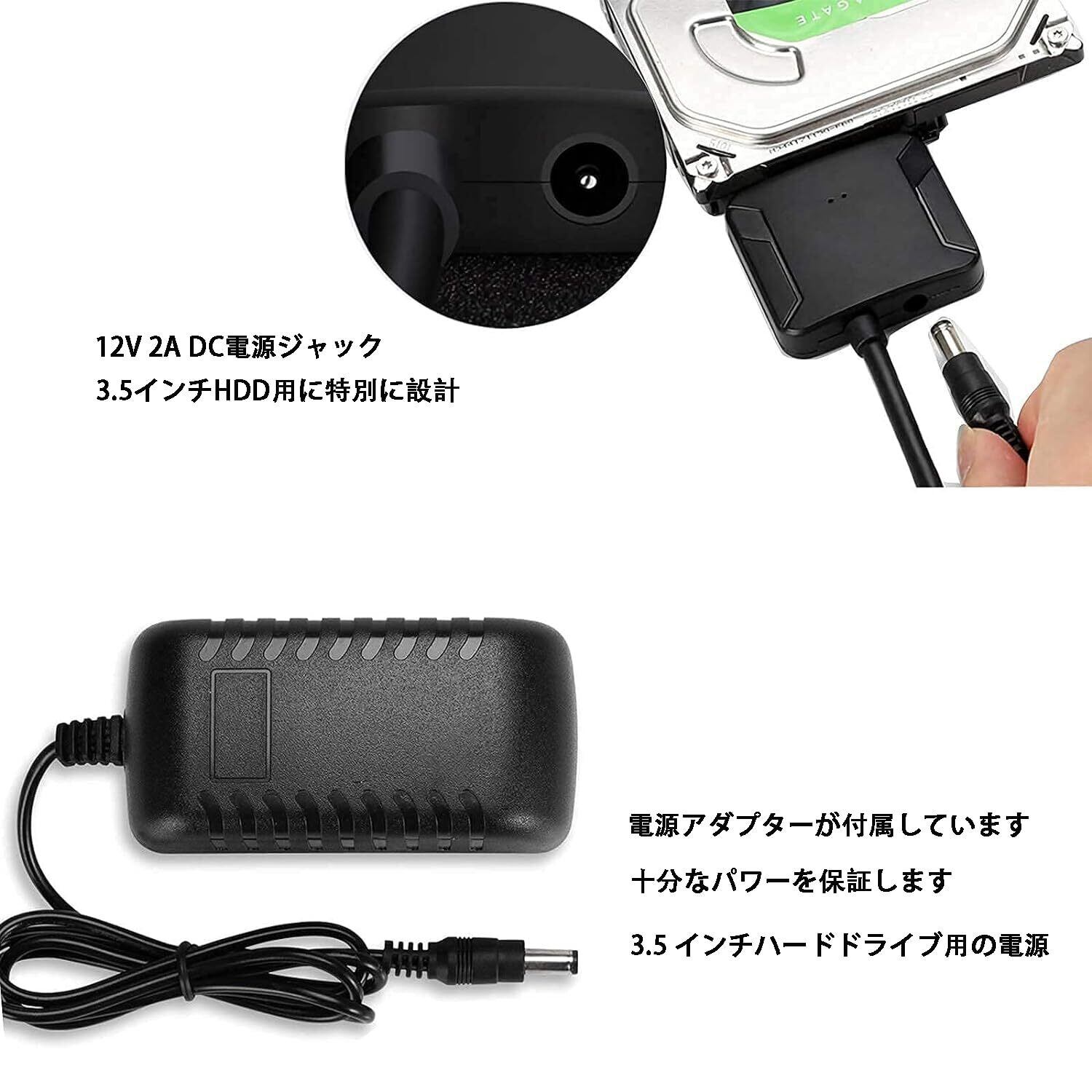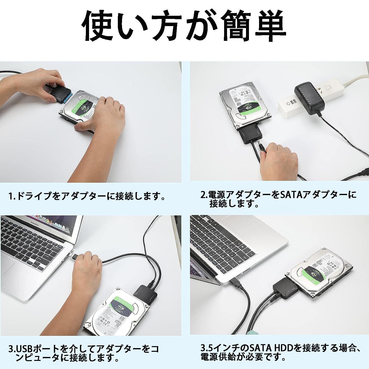 【SATA USB変換ケーブル】3.5インチSATA HDDおよび2.5インチSATA HDD SSDドライブをUSB3.0でコンピューターに接続し、データへのアクセスとバックアップを行うことができます。ただし、消費電力が高いデバイス(3.5インチHDD)を接続する場合は、付属の電源アダプターで給電してください。