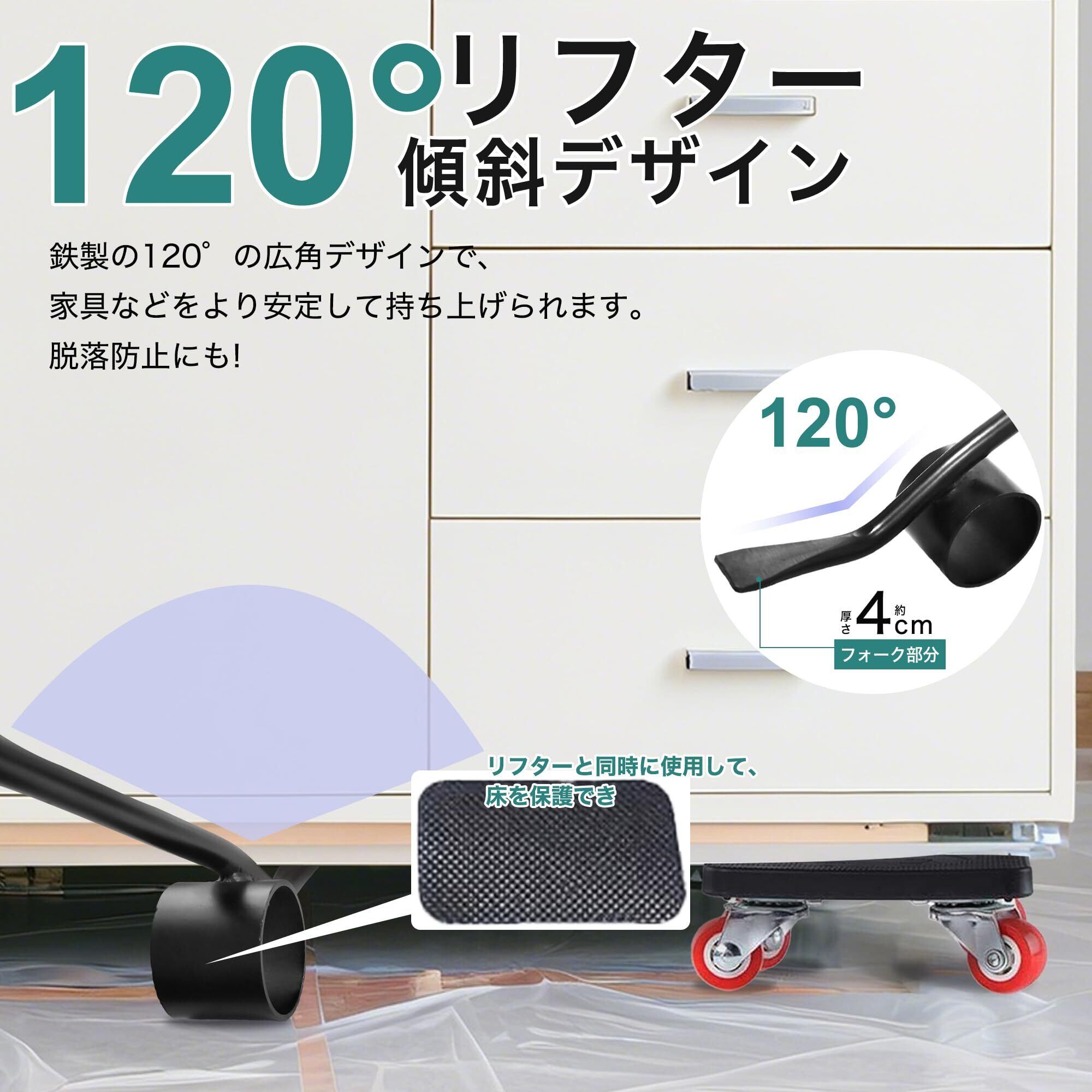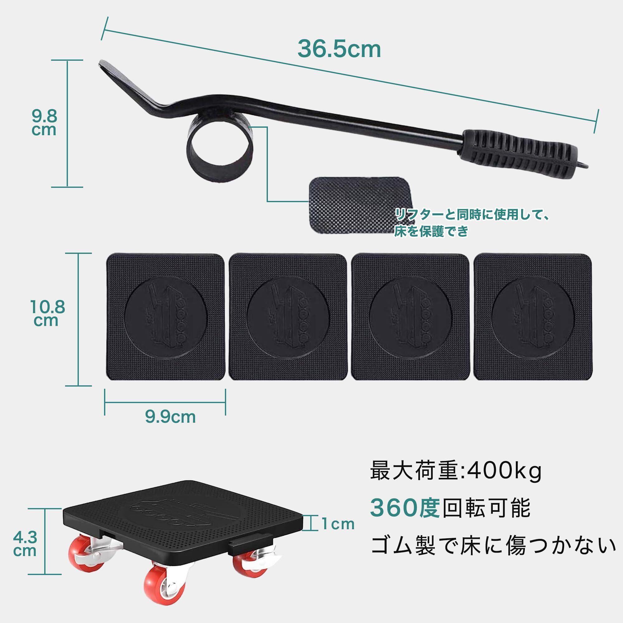 ● 持ち上げ棒:少しの隙間にもしっかり入れる薄さです。粘着性の滑り止めマット×2枚が付属して滑らないうえ床に傷をつかない。台車が360度回転可能でソファ、本棚、テーブル、椅子、ベッド、ピアノ、洗濯機/乾燥機、冷蔵庫などに最適です。