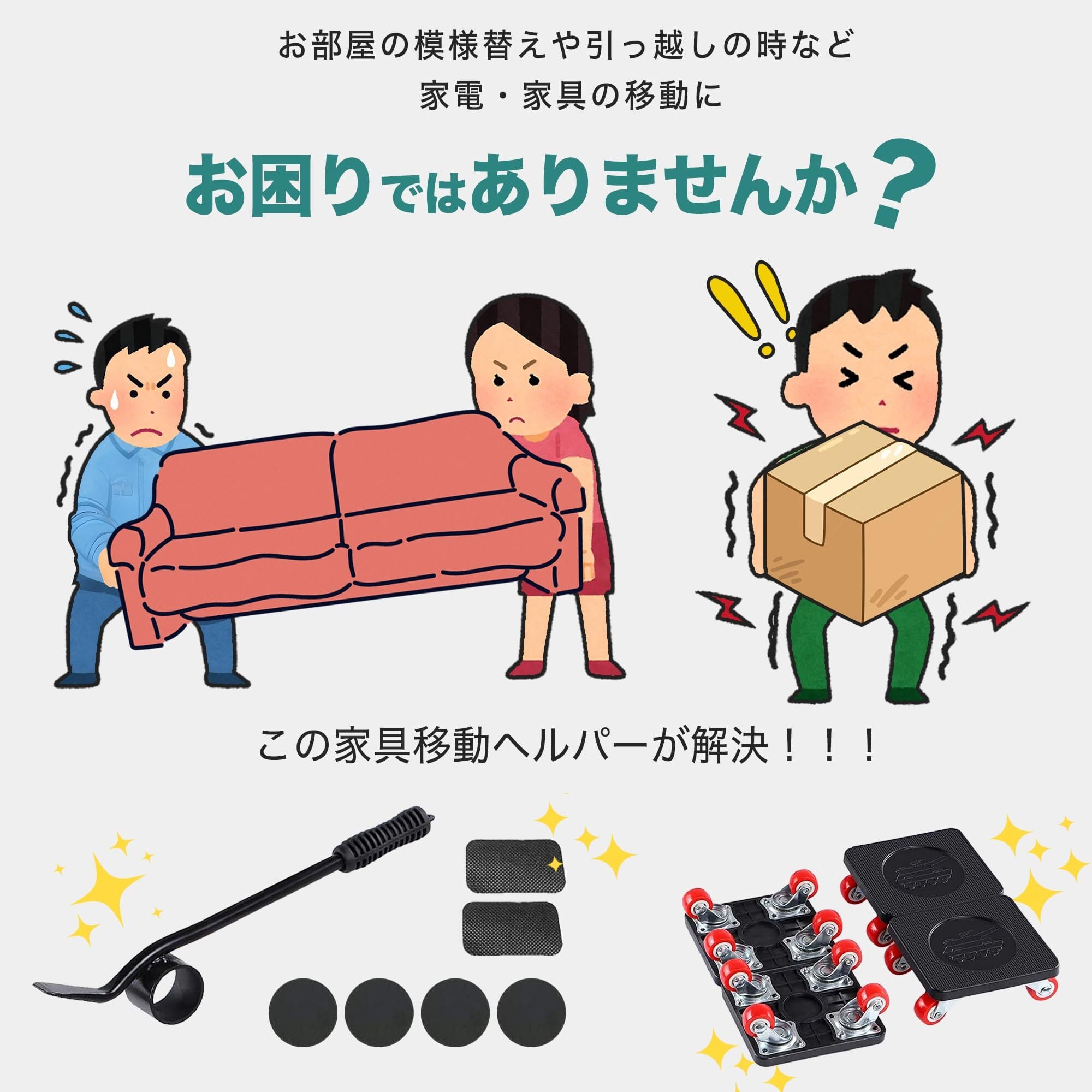 ソファ、ベッド、ワードローブ、テーブル、冷蔵庫、洗濯機、これらの重い家具を場所を移動したい場合はどうでしょうか。 暮らしの中の「小さな困りごと」のひとつかもしれません。 そこでこのらくらくヘルパーてこの原理で重い物もラクラク移動可能!!最大400kgの物まで移動できますので、家庭内のほとんどの家具に対応します。 ●テコの原理を利用して約5分の1の力で持ち上げ可能、完成品(組立不要)。 ●お部屋の模様替えや重たいプランターの移動、お掃除したいテレビボードの後など日常できなかったことを、このらくらくヘルパーで手助けしてくれる。 ●女性でも軽々持ち上げ!楽々移動! 大掃除や模様替え、地震対策グッズの設置にも大活躍 ●家具などの重い荷物の移動時に力を発揮 【使用手順】 1:持ち上げたい家具等を押しながら持ち上げ棒を奥までしっかり差し込む 2:ローラーが進行方向に向くように台車を対象物の四隅に設置 3:ゆっくりと家具を移動させる 4:台車を取り除く 【使用上の注意】 背の高い家具や設置場所によっては台車が上手くセットできない場合があるので、二人以上での作業を推奨 傷つきやすい白木の床材や柔らかい床には台車のローラー痕が残ったり、台車が沈んで外れる恐れがあるので使用不可 らくらくヘルパー 家具・家電の移動キャリー 家具移動 台車 背の高い家具や設置場所によっては台車が上手くセットできない場合があるので、二人以上での作業を推奨します。 らくらくヘルパー 用途 冷蔵庫、洗濯機、テレビ、床、箪笥、各種類大家具の運搬。 【用途】 部屋の模様替え、大掃除や減災対策、引越し等。 キズの付きやすい床材、持上げ対象物での使用は、キズや凹みになる場合があります。 段差や傾斜のある床面、毛足の長いカーペット、絨毯での使用は、できません。 改造や加熱、加工等をすると著しく品質の低下の恐れがあります。 リフターに体重を乗せる てこの原理で100KGの重い物でも、わずか19KGの力でらくらく持ち上げられます。 新設計のフォルム フォーク先端は大きな曲線と厚さを薄く仕上げていますので、さらに家具の下に入れやすくなっています。 ラウンドフォーク フォークの形状を改良することにより、今まで台車が入りにくかったスチール製の棚も持ち上げられます。 特別に設計の台車 4軸4組の車輪(ローラー)なので、たたみの縁、フローリングの継ぎ目、タイルや石貼りフロアーの目地に車輪(ローラー)が落ちることがなく、安全に移動できます。 ※高さが足りない時、リフターの下に雑誌や電話帳などで作業域全体の高さを上げて作業してください。