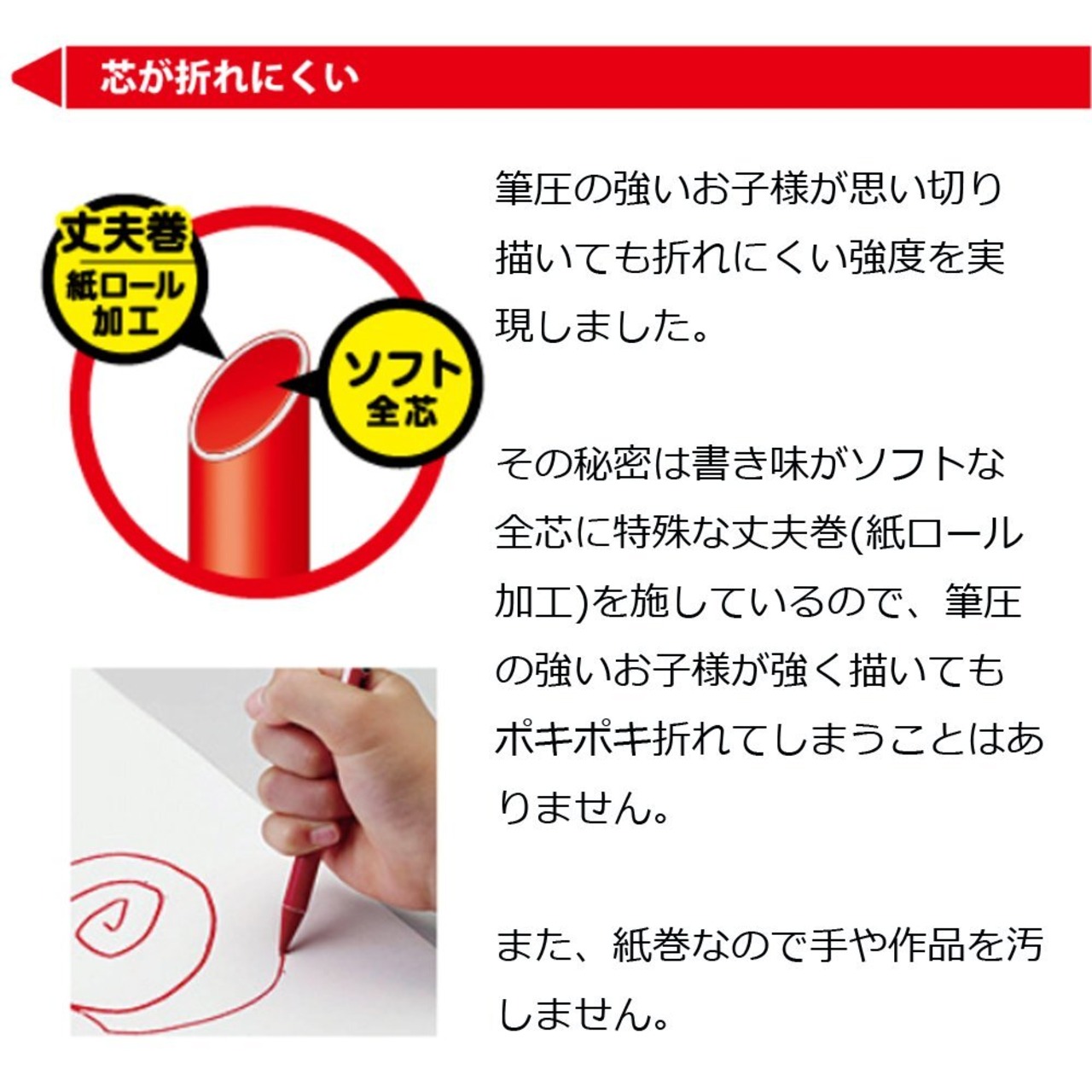 特殊な丈夫巻(紙ロール加工)を施しているので、筆圧の高いお子様が使用しても、ポキポキと折れることが少なく、紙巻なので手や作品が汚れにくい仕様になっております。