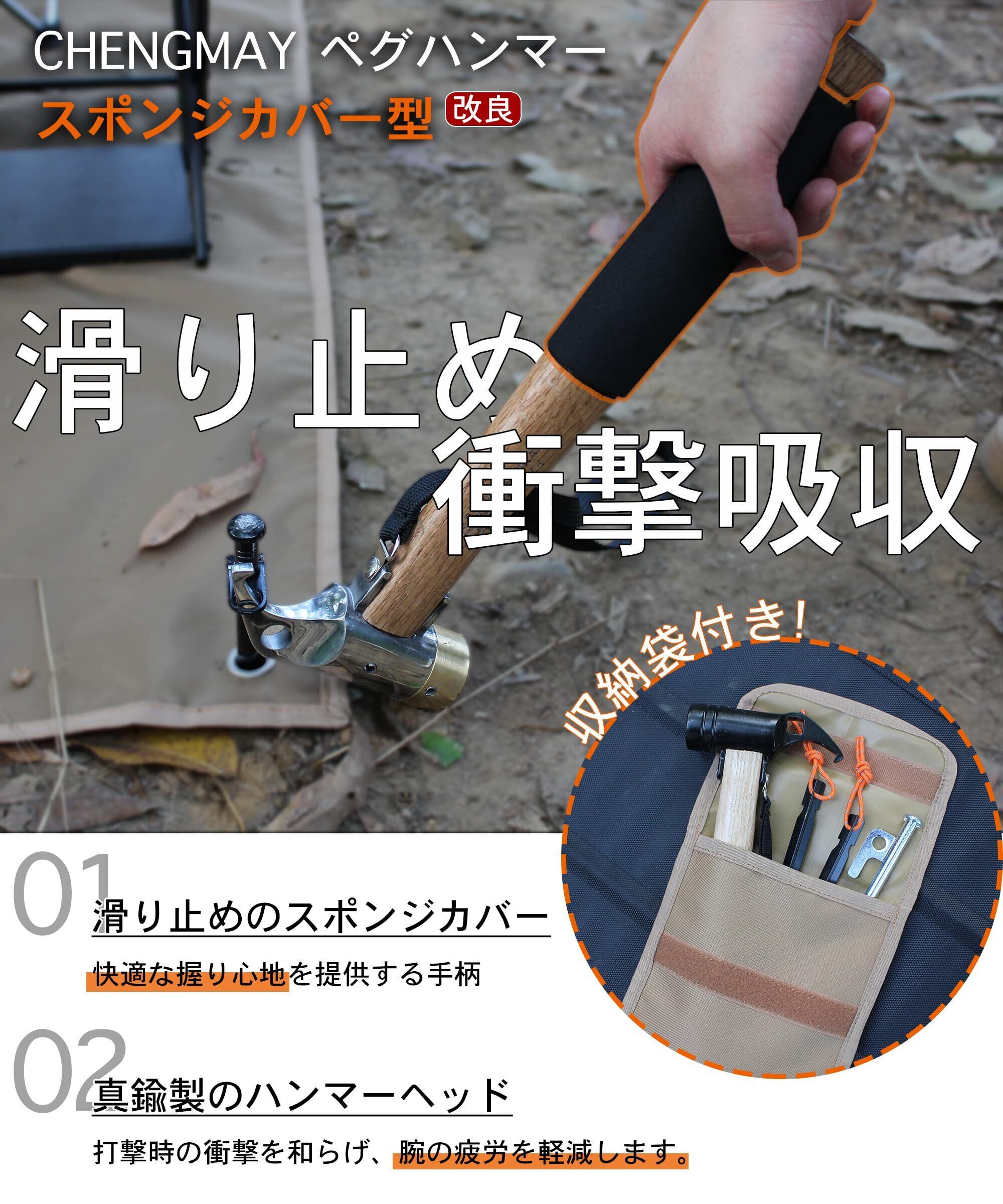 CHENGMAY ペグハンマー 真鍮製ヘッド 滑り止めグリップ キャンプ ハンマー アウトドア テント用 ペグ打ち/抜く 固定用 安全 ベルト付 収納ケース付 (黄銅製ヘッド)