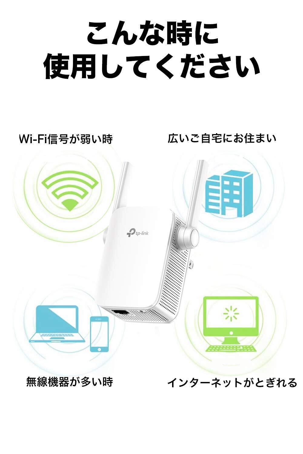 [WiFi中継器の特徴] 高性能アンテナとコンパクトボディ。無線LANルーターと繋げてWi-Fiを中継。