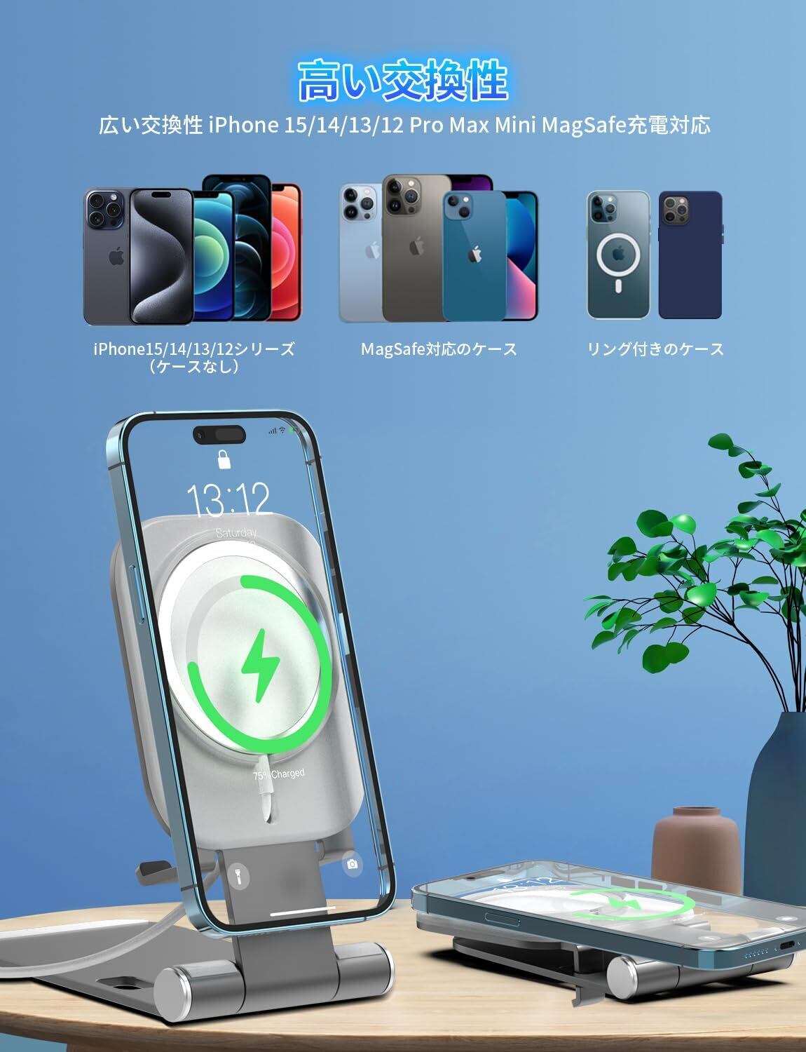 ワイヤレス充電器 Magsafe マグネット式 iPhone 16/15/14/13/12 Pro Max Miniシリーズ対応【ワイヤレス充電スタンド+ 20W USB-Cアダプター付属】USB-Cケーブル付き 折り畳み式 角度調節 スマホ充電器 スタンド/パッド 小型 軽量 くっつくと急速充電 貼り付け qi対応 マグセーフ充電 (ディープシルバー)
