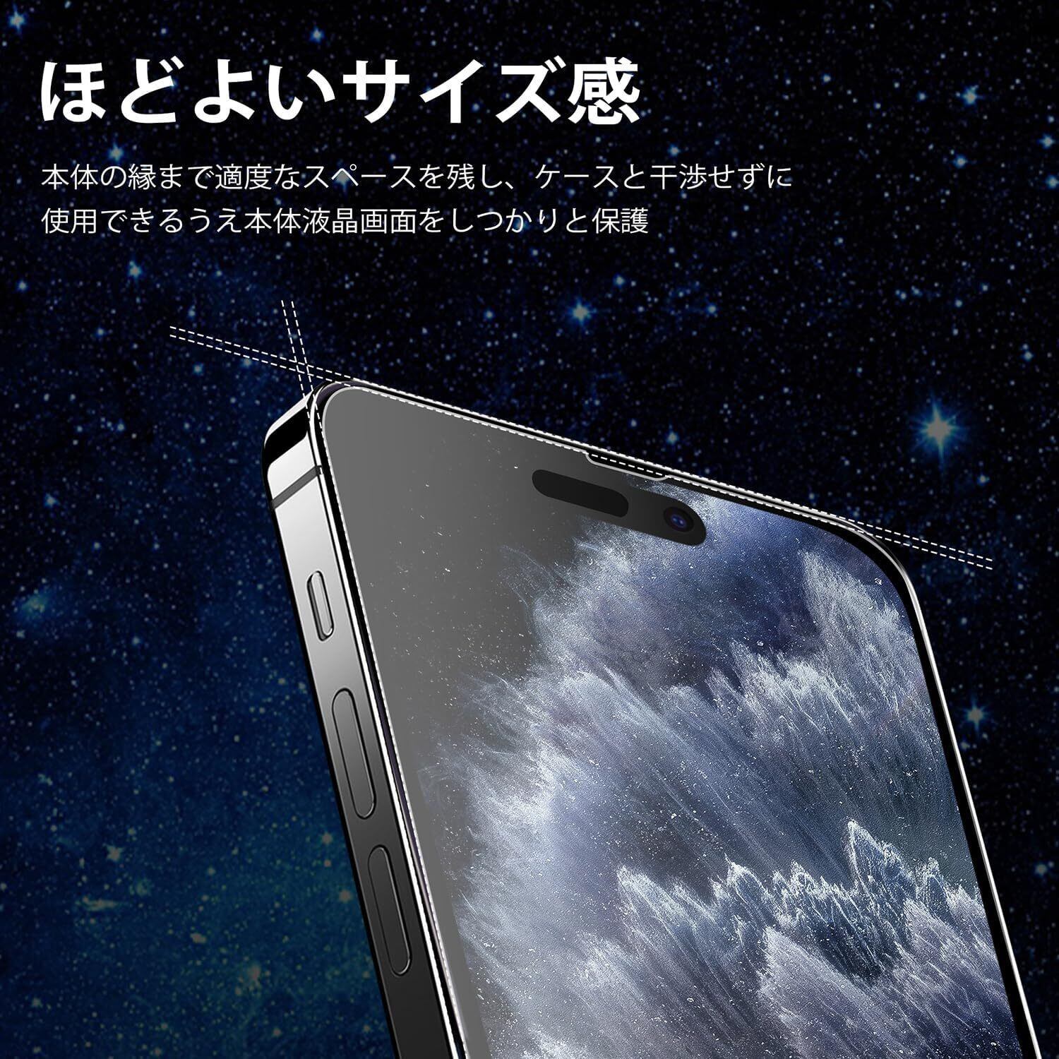 『 対応機種 』iPhone 14 promax 用(6.7インチ対応)。携帯は端部のカーブがフィルム剥がれ、浮きの防止、スマホケース装着スペース確保のため、機器の曲面の縁にスペースを残すデザインとなっています。【パッケージ内容】 iPhone 14pro max ガラスフィルム * 2枚セット* 1枚セット。