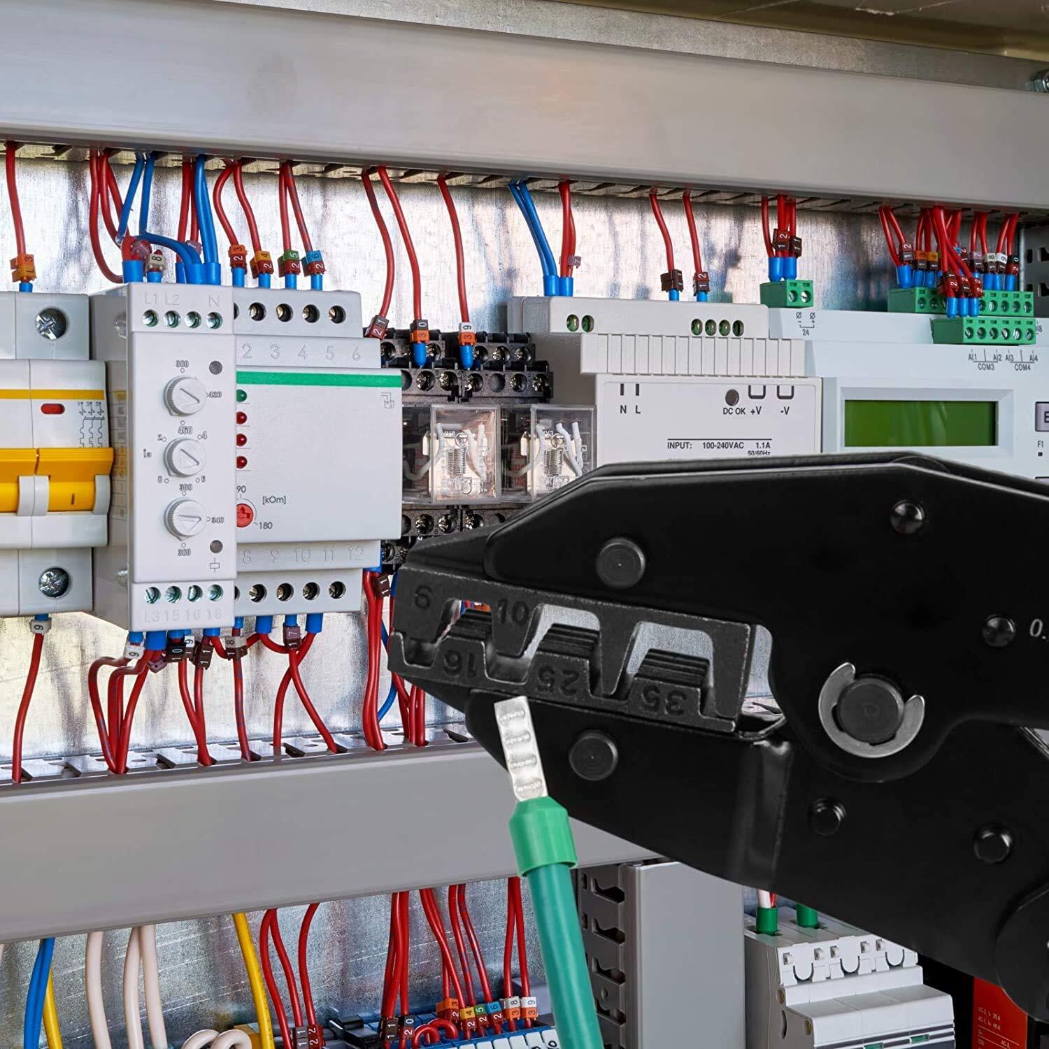 圧着ペンチ圧着能力:①フェルール0.3sq、0.75sq、1.25sq、2sq、3.5sq、5.5sq、8sq ②フェルール5.5sq、8sq、14sq、22sq、38sq ③絶縁端子 (赤)0.5sq~0.75sq、(青)2sq、(黄)3.5sq~5.5sq ④裸端子 0.5sq、1.25sq、1.5sq、2sq、3.5sq、5.5sq ⑤オープンバレル端子 0.5sq、0.75sq-1.25sq、35sq〜5.5sq ⑥熱収縮防水圧着端子 0.5sq〜1.75sq、1.0sq~3.0sq、3.5sq-6.0sq