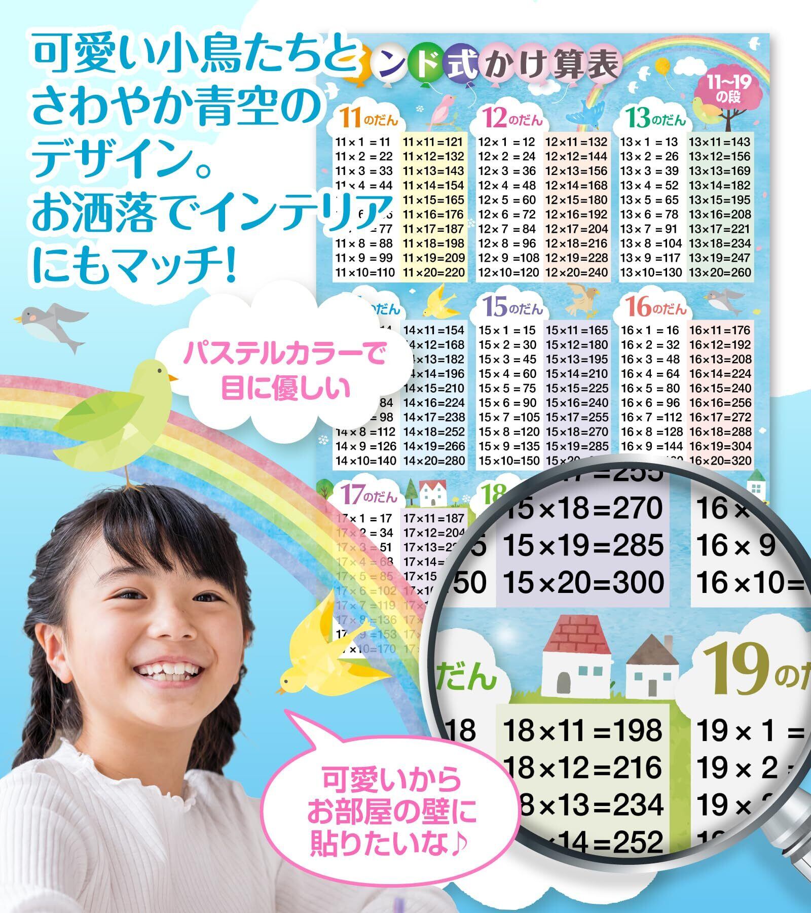 【高度な11〜20の段までを網羅】 ポスターには11の段から20の段までのかけ算が網羅されており、基本の九九を習得したお子様がさらに高度なかけ算を学ぶことができます。段ごとに色分けされているため、どの段を学んでいるのかが一目でわかりやすく、学習の進捗を確認しやすい構成になっています。
