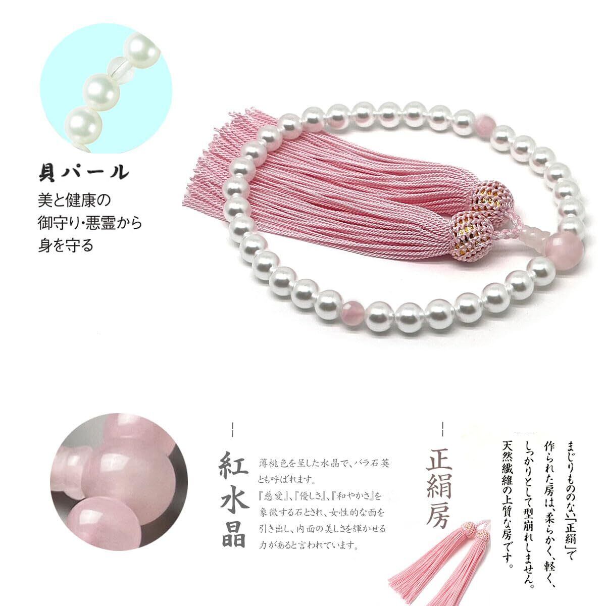 【新着商品】永善念珠屋 数珠 女性用 貝パール 【西陣織 数珠袋付き】天然貝核 人絹房 ピンク紅水晶 念珠 全ての宗派で使える じゅず 女性 念珠 手作り 記念品 葬儀 葬式 法事 法要 マイ数珠 (紅水晶) | わくわくSHOP