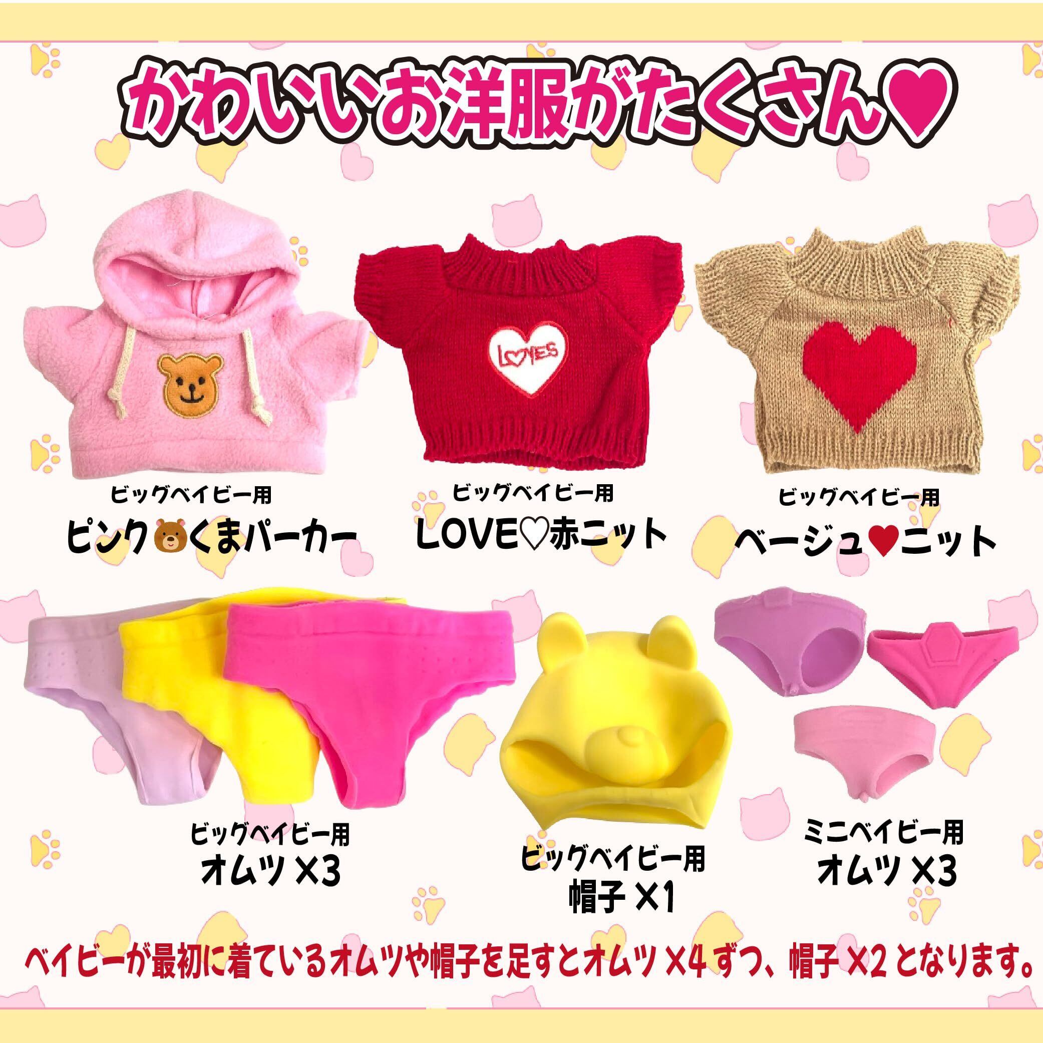 ■セット内容: ベイビー 3体 (ビッグベイビー、ミニベイビー、蓄光ミニミ二ベイビー)、お洋服 3枚(ビッグベイビー用) 、帽子 1枚(ビッグベイビー用) 、オムツ 3枚(ビッグベイビー用) 、オムツ 3枚(ミニベイビー用)、持ち運び可能なバッグ付き! ※蓄光ミニミニベイビーのお洋服等のグッズはございません。