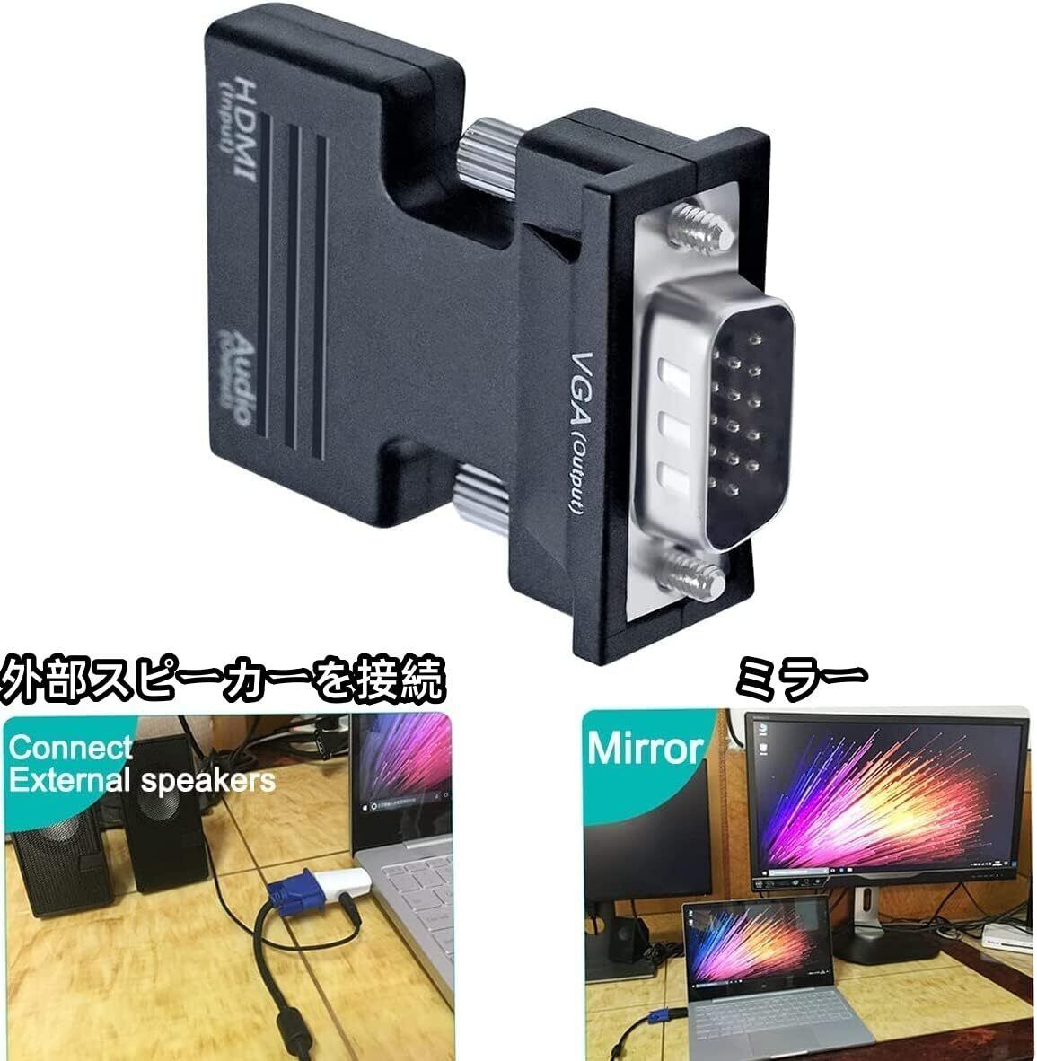 HDMI信号をVGAアナログ信号に変換できるアダプタ。HDMI出力をもつパソコンからミニD-sub15ピン(VGA)入力をもつプロジェクターやディスプレイに出力可能。※ご注意:HDMIからVGAにのみ変換します、逆方向変換は非対応です。